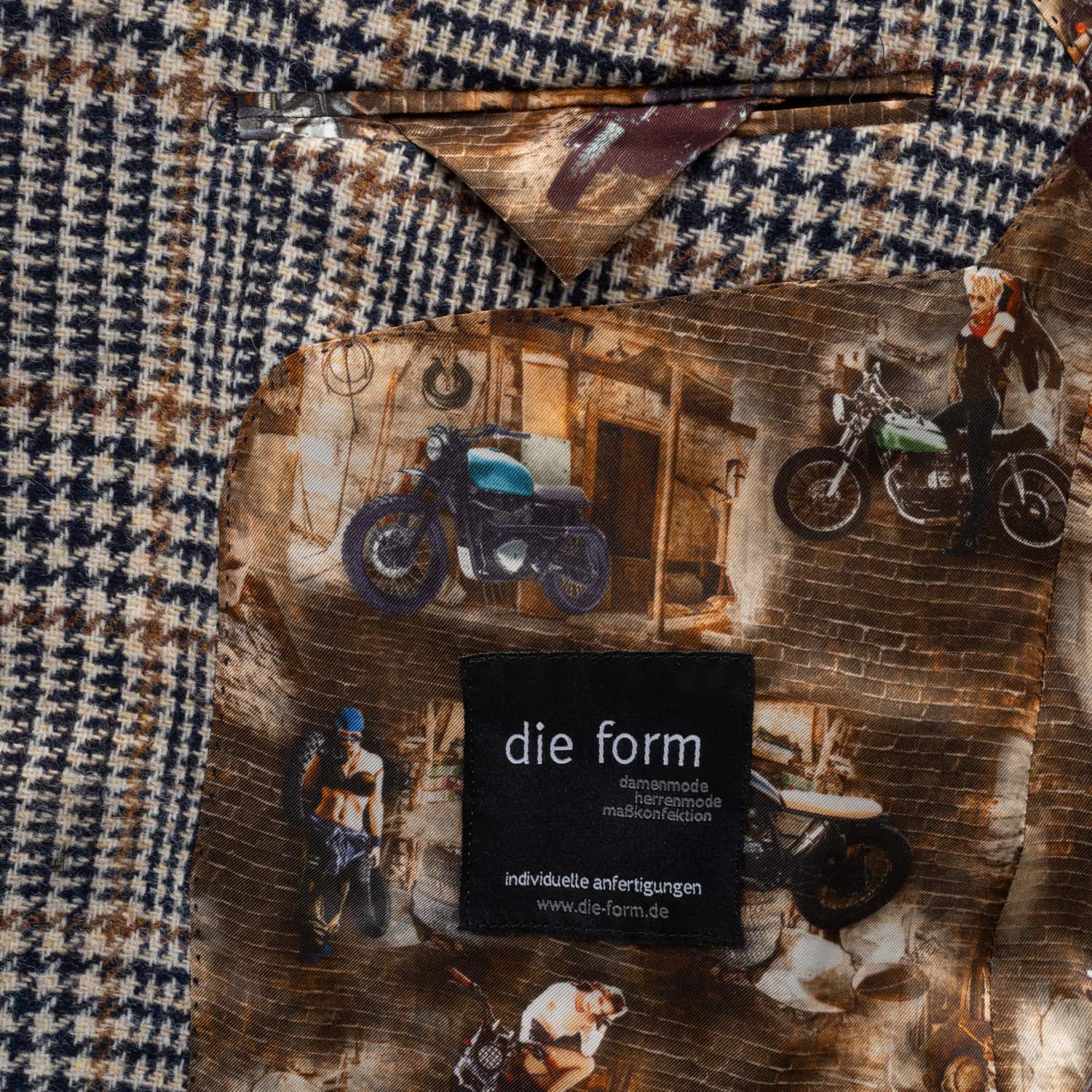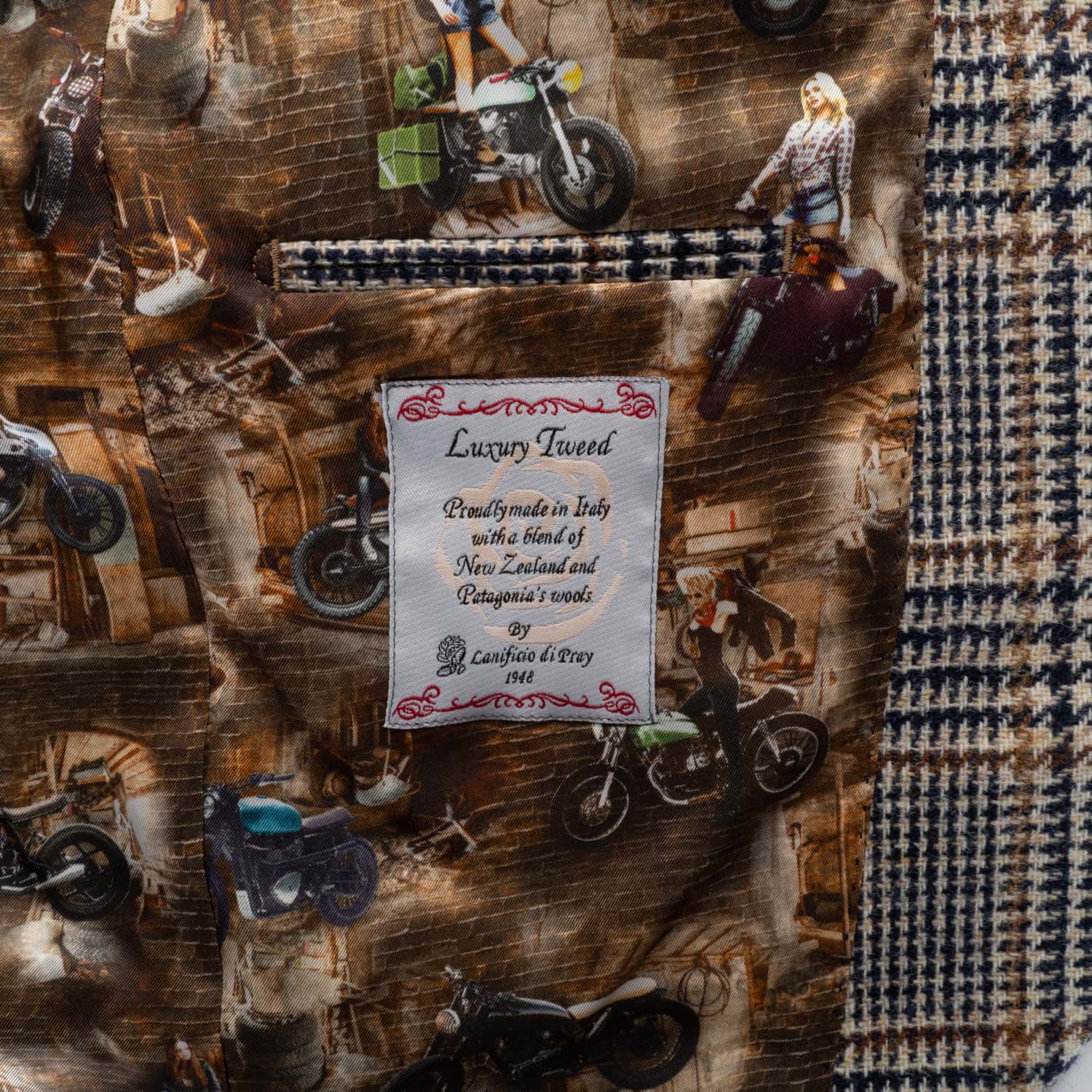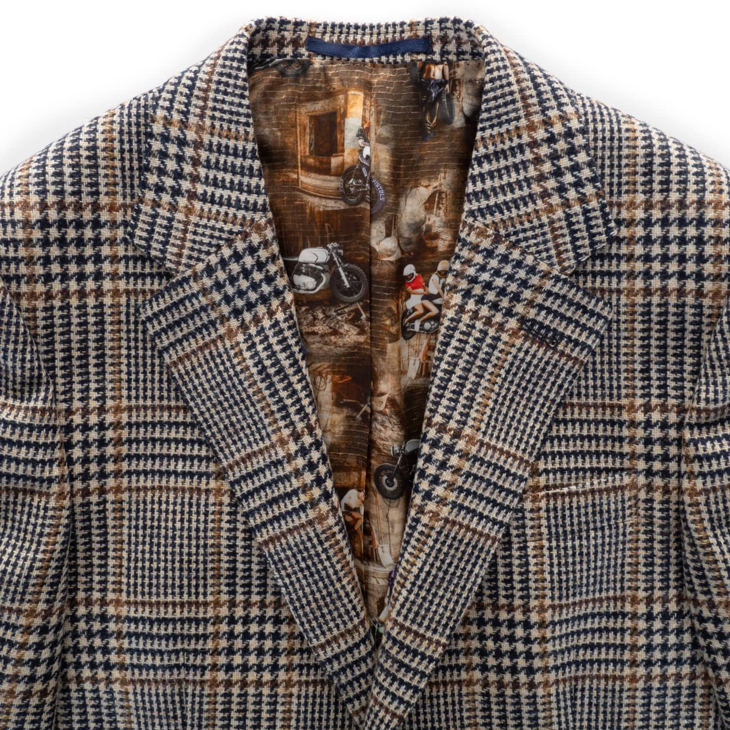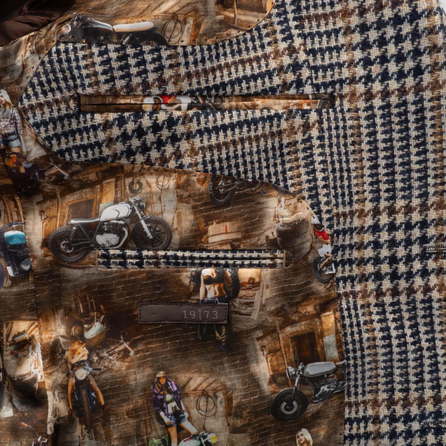 Charismatisches Herren-Sakko aus 100 % Wolle (Schurwolle) von 1973, gefertigt aus luxuriösem Tweedgewebe mit markantem Glencheck-Karomuster in Braun und Blau. Der Stoff stammt aus der renommierten italienischen Weberei Lanificio di Pray und kombiniert Wollen aus Neuseeland und Patagonien – für eine besonders weiche, zugleich robuste Qualität. Das charakteristische Innenfutter mit Motorrad-Print sowie die aufgesetzten Wildleder-Ellenbogenpatches verleihen dem Modell eine individuelle Note. Perfekt für Herbst und Winter – ob im Office oder leger zur Jeans.
