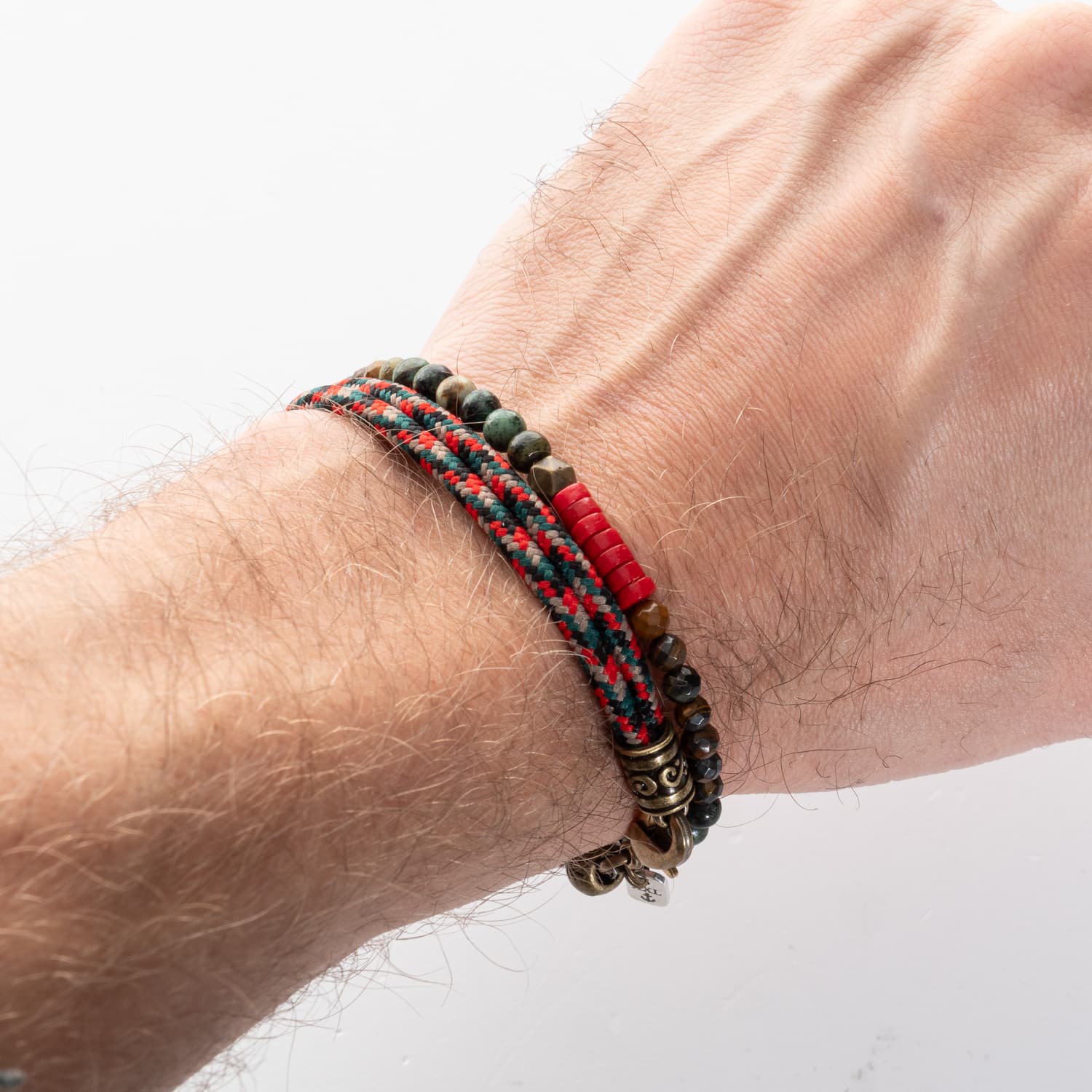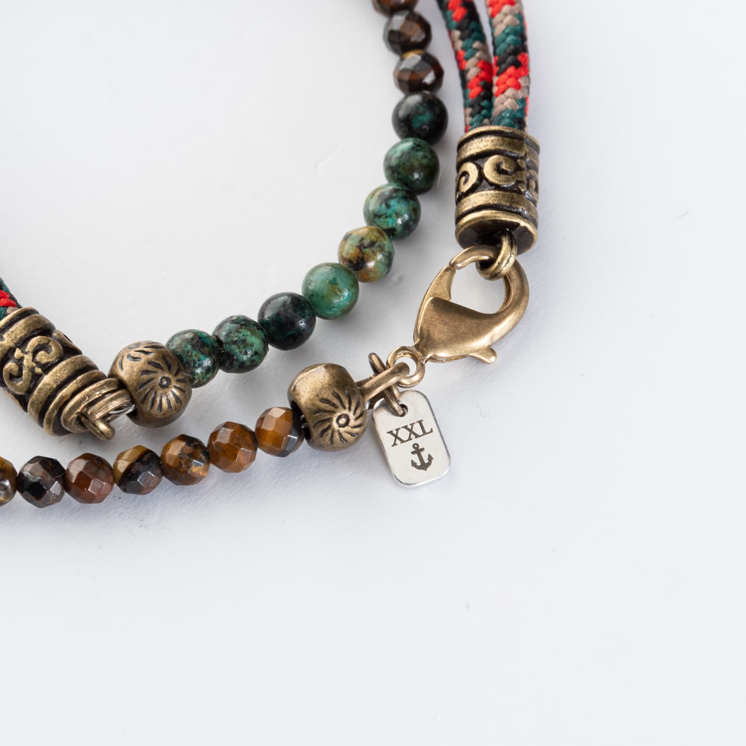 Das Armband Graham von XXL Hardwear verbindet markantes Design mit symbolischer Tiefe. Die Kombination aus gewebter Kordel und natürlichen Mineralien schafft einen spannenden Kontrast zwischen Struktur und Natürlichkeit. Mit Tigerauge- und Vulkangestein-Perlen verziert, steht es für Erdung, innere Stärke und Entschlossenheit. Durch das doppelt gewickelte Design entsteht eine kraftvolle, handwerklich geprägte Optik, die jedes Outfit bereichert. Jedes Armband ist handgefertigt und damit ein echtes Unikat – mit kleinen Variationen in Farbe und Struktur, die seine Echtheit unterstreichen.