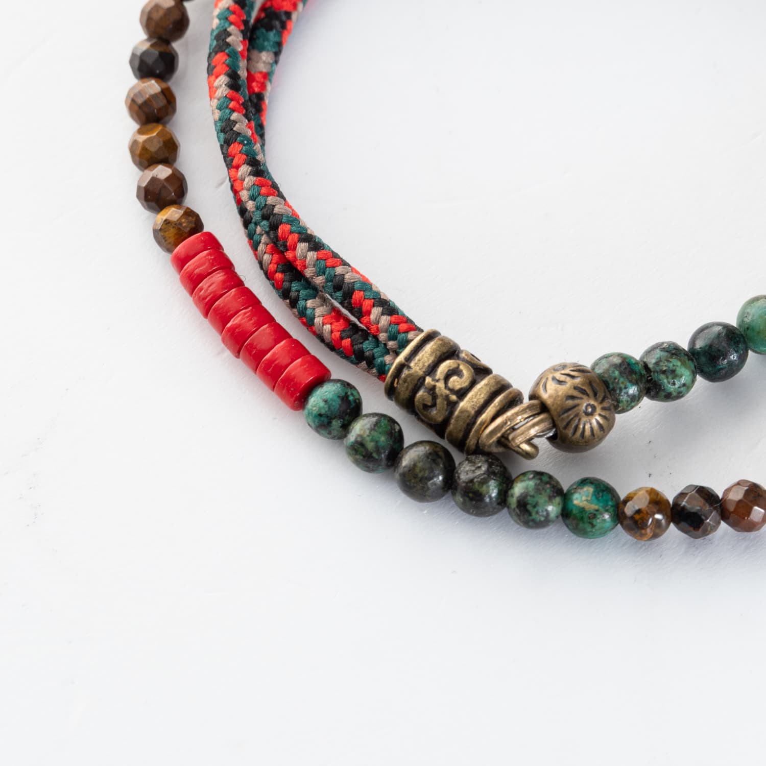 - Materialien: Tigerauge, Vulkangestein, gewebte Kordel
