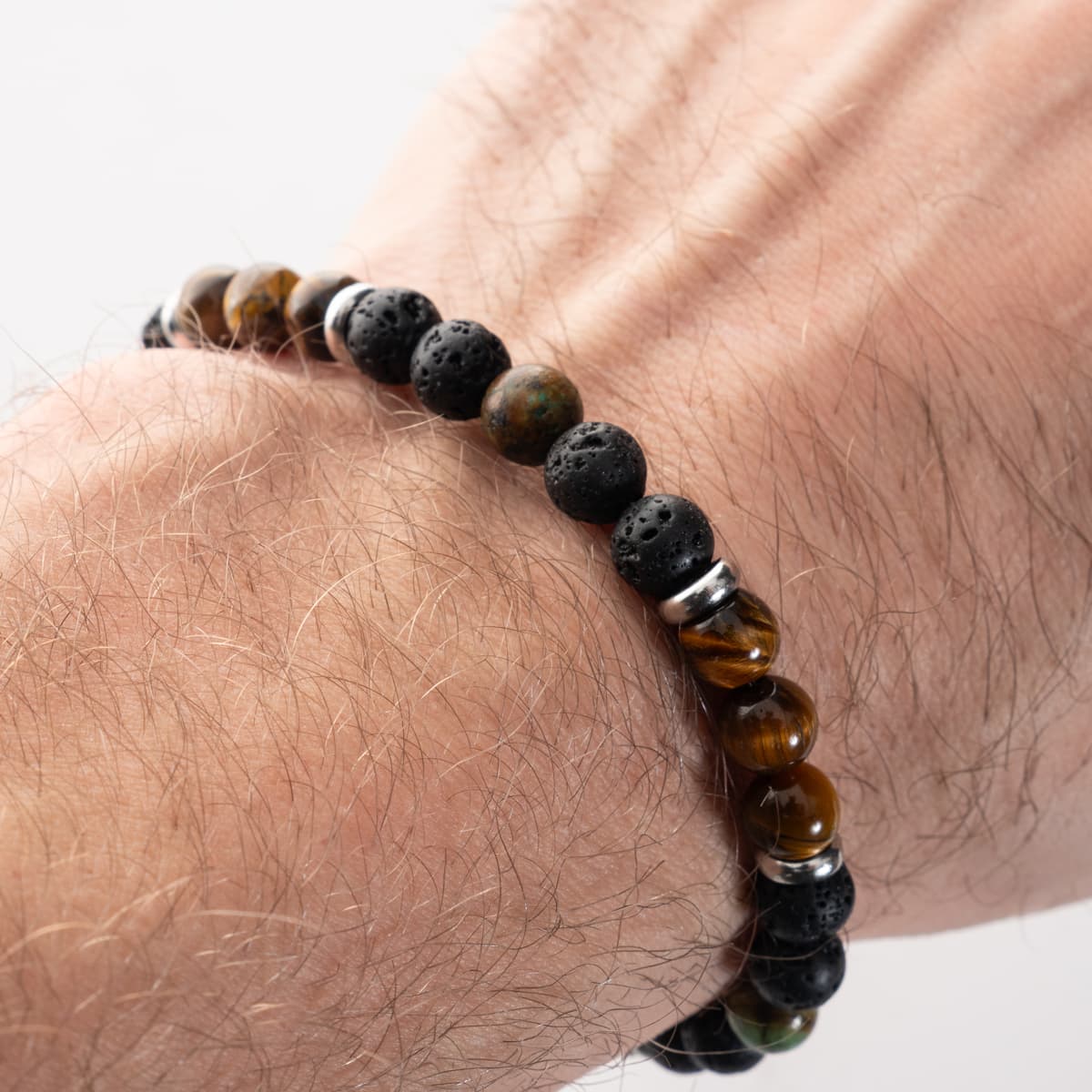 - Kontrast aus goldbraunem Tigerauge, grünem Achat und schwarzem Vulkangestein
