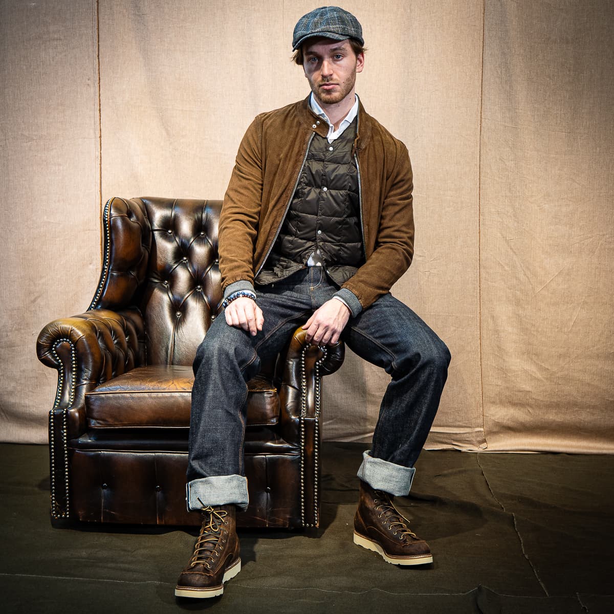 Schmal geschnittene 5 pocket selvedge Jeans. Produktmerkmale sind die historische Webkante, Kappnähte, extra verstärkte Gesäßtaschen mit verdeckten Taschennieten, ungewaschen. Nummerierte Lederetiketten aus strikt limitierten Kleinserien machen jedes Teil auch zu einem Sammlerstück. Alle Materialien, wie Knöpfe, Nieten, Garne, Leder- und Papieretiketten werden aus Deutschland bezogen.
