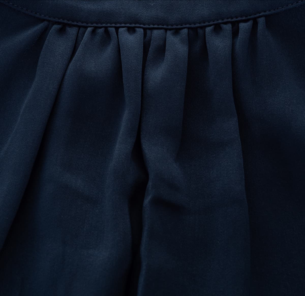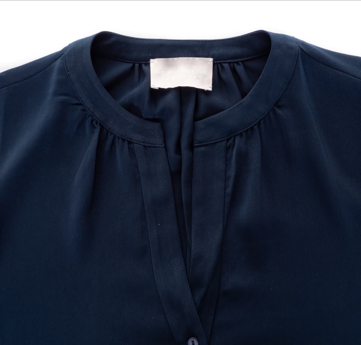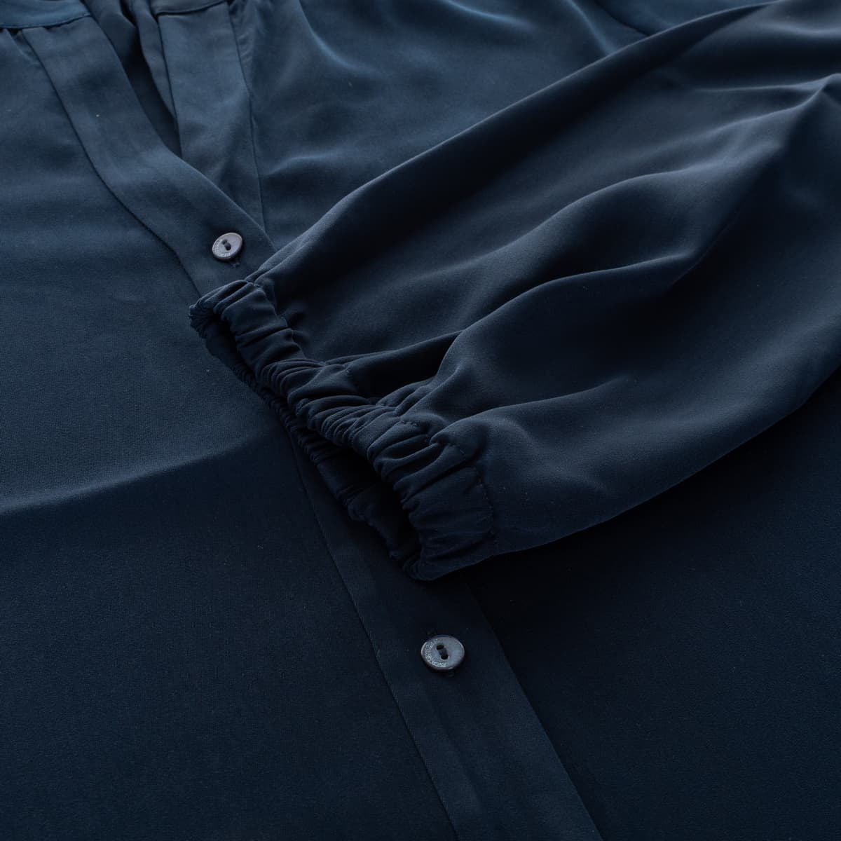 Fließende Bluse „Silkie“ von HEMISPHERE in eleganter Marinefarbe. Das Modell präsentiert sich mit einem femininen, leicht ausgestellten Schnitt und feinen Raffungen am Kragenansatz. Die Knopfleiste und die elastischen Ärmelabschlüsse verleihen der Bluse eine legere, dennoch gepflegte Anmutung. Der weiche Stoff fällt sanft und sorgt für ein angenehmes Tragegefühl – ideal für Büro, Freizeit oder Abendanlässe.