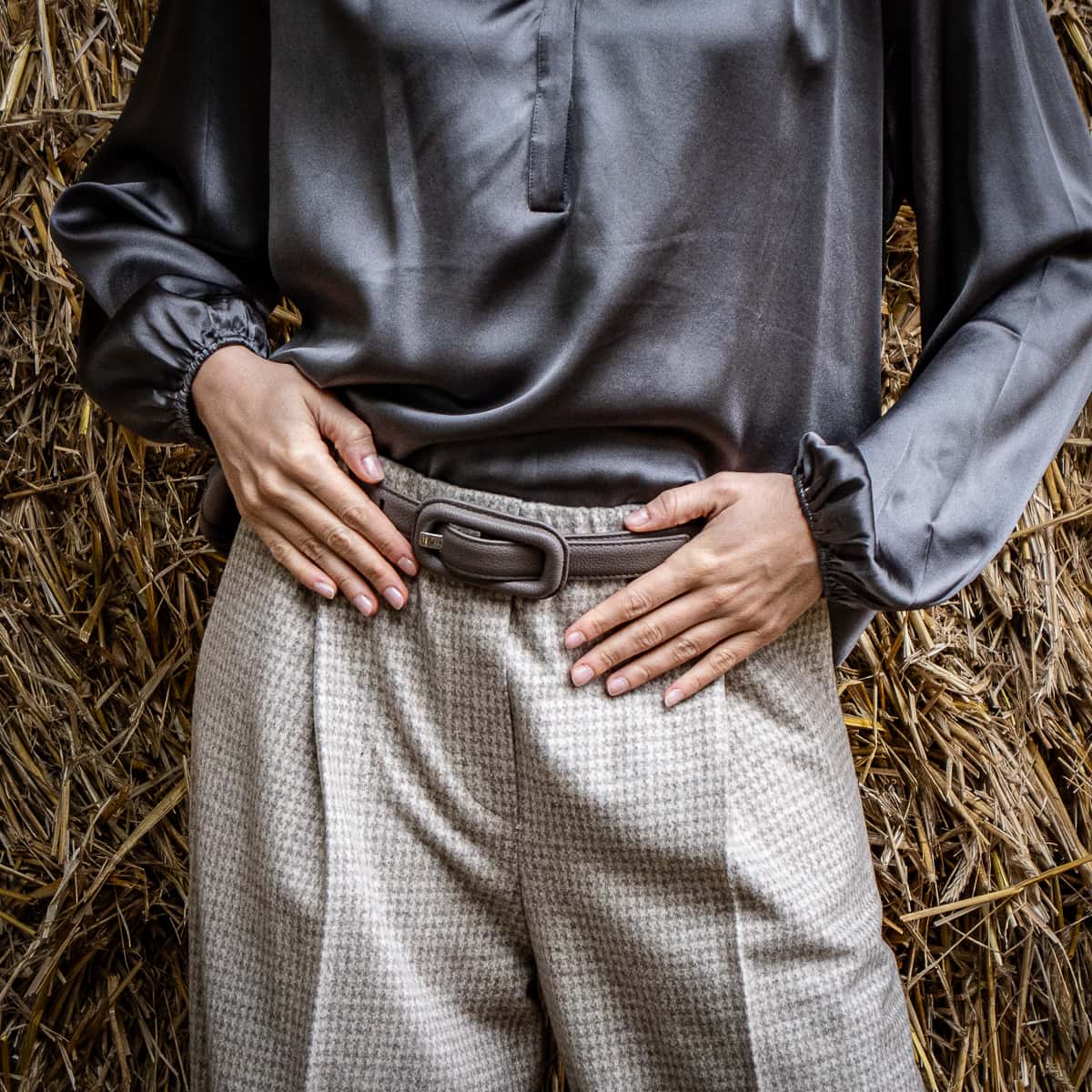 Elegante Bluse aus edlem Seiden-Elasthan-Mix von Charlotte Sparre in zeitlosem Khaki. Mit femininer Silhouette, lockerem Schnitt und leichtem Glanz – perfekt für Business oder besondere Anlässe.