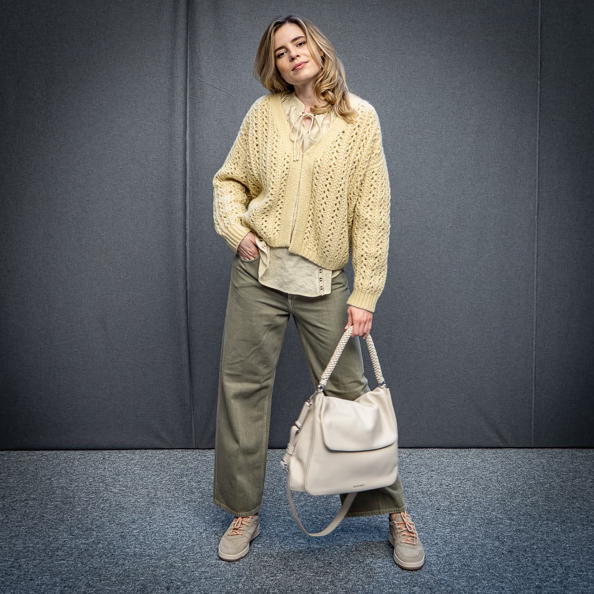 Die Orciani Diana Handtasche in einem sanften Beige überzeugt mit ihrer femininen Eleganz und einem Hauch von lässigem Luxus. Gefertigt aus feinstem, genarbtem Leder, zeigt sich die Tasche in einer weichen, leicht fließenden Form, die durch den geflochtenen Henkel ein charmantes Detail erhält.