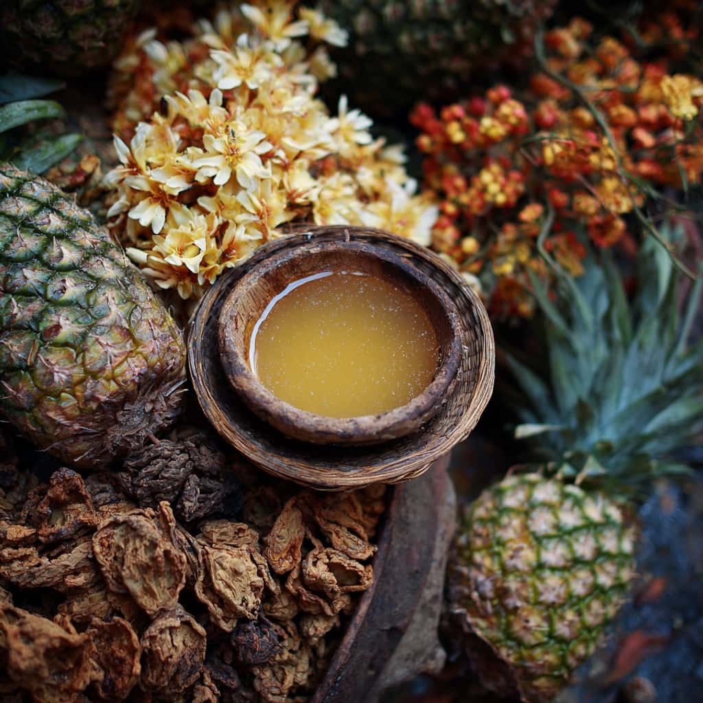 Ein Ausbruch tropischen Lichts eröffnet diesen Duft: saftige Ananas (Headspace), knackige Birne und spritzige Zitrone. Im Herzen entfalten sich die floralen Noten – samtige Orangenblüte, zarte Pfingstrose und frische Geranie – bevor das edle Al Saffi Oud die Bühne betritt, tief, balsamisch und warm. In der Basis verschmelzen erdiges Patchouli und sonnengewärmtes Leder mit dem Oud-Holz zu einer vibrierenden Komposition, die zwischen reifer Frucht und holziger Mystik schwebt.
