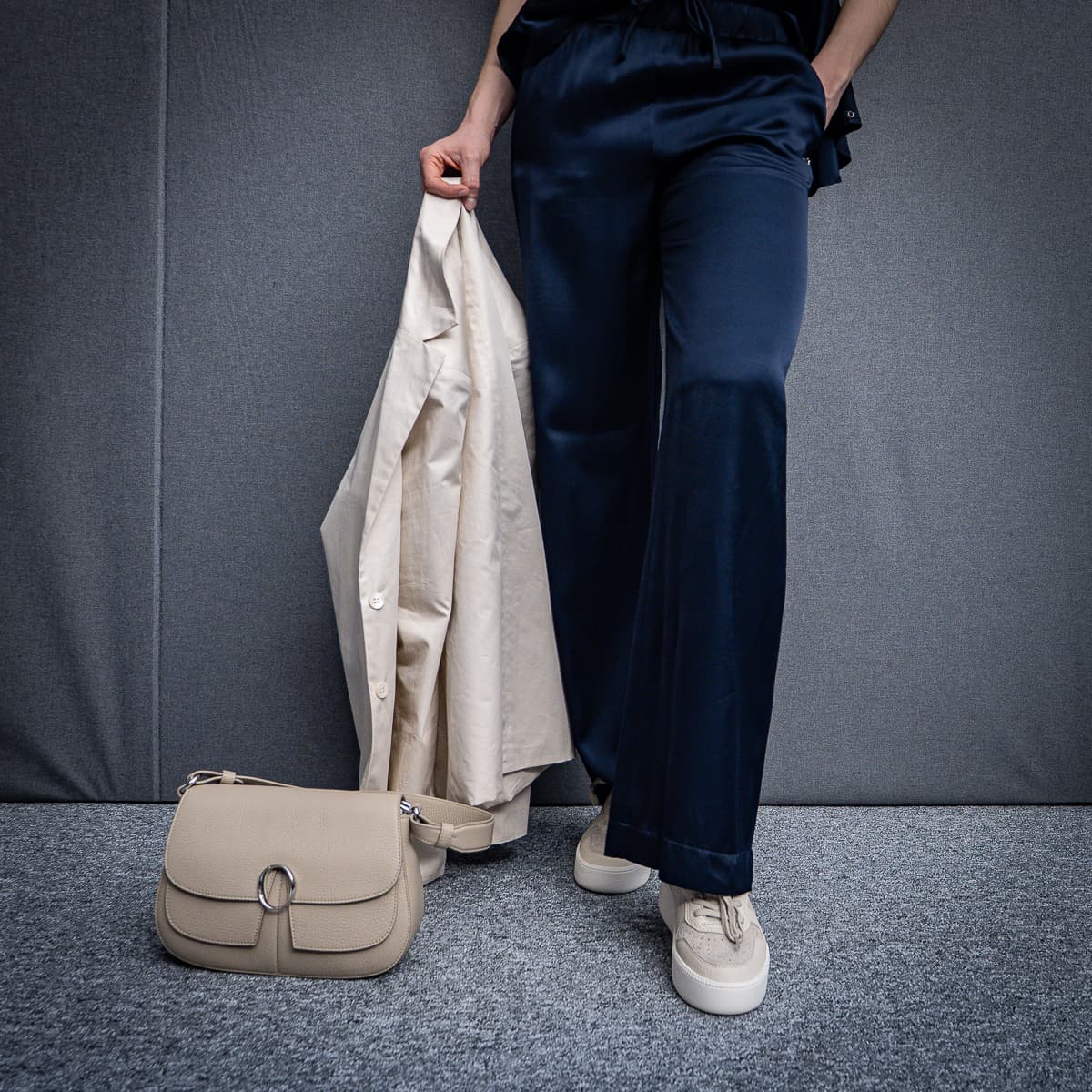 - Seitlicher Streifen aus cremeweißem Leder