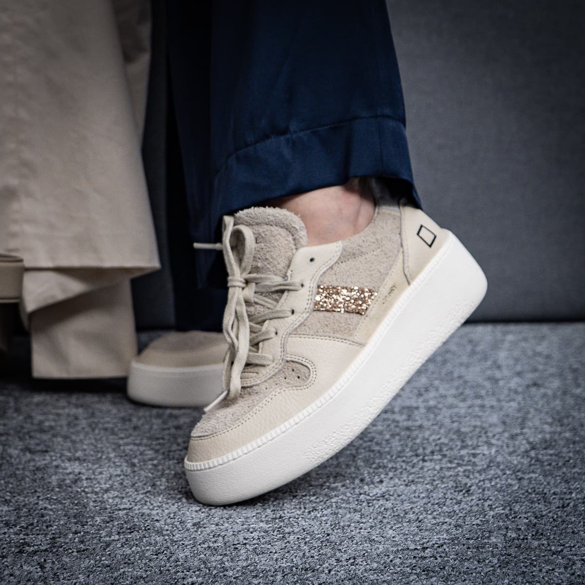 Die Court Platform Sneaker von D.A.T.E. präsentieren sich in einem modernen Beige-Ton aus Veloursleder mit edlen Glitzerelementen. Das Modell kombiniert sportliche Lässigkeit mit femininen Details und sorgt dank Plateau-Sohle für eine stilvolle Silhouette. Das perforierte Veloursleder an der Vorderkappe bietet optimale Atmungsaktivität, während die gepolsterte Innensohle und die erhöhte Plateausohle höchsten Tragekomfort gewährleisten.