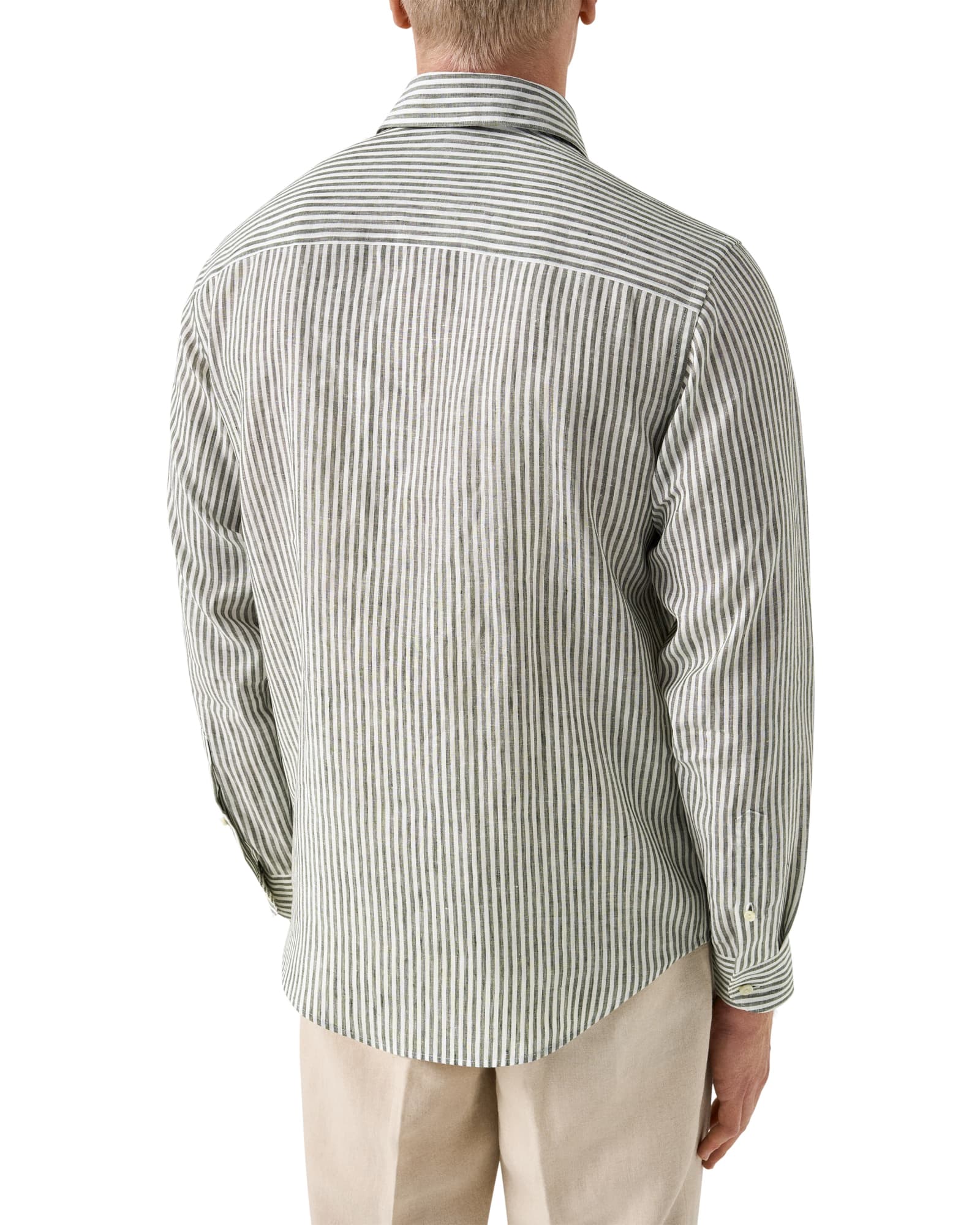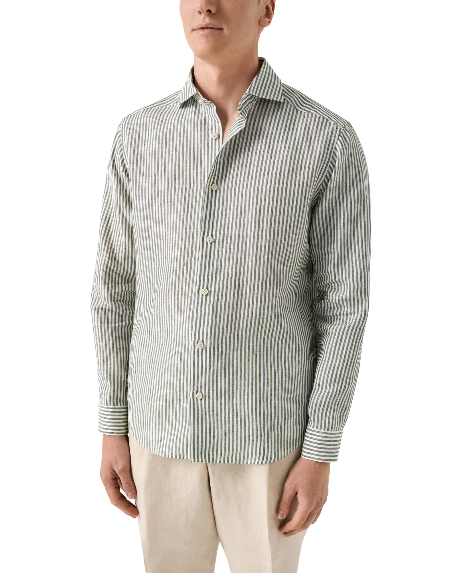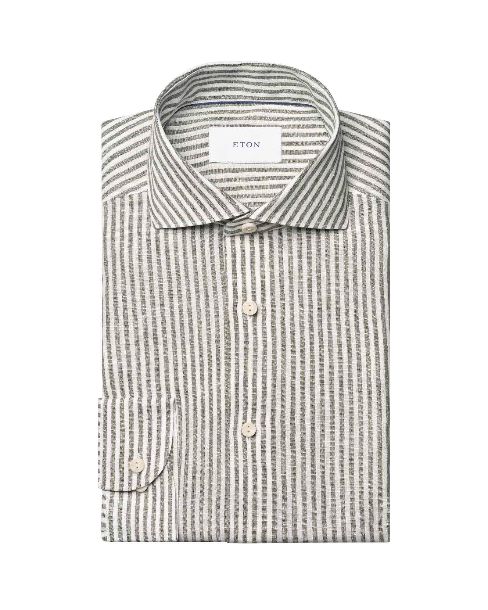 Dieses gestreifte Leinenhemd von Eton verbindet sommerliche Leichtigkeit mit klassischer Eleganz. Gefertigt aus 100 % hochwertigem Leinen, gewebt von der renommierten italienischen Weberei Albini, überzeugt der Stoff durch seine klare Bengalstreifen-Optik und eine angenehm natürliche Haptik. Leinen ist von Natur aus feuchtigkeitsableitend und temperaturregulierend – ideal für warme Tage. Durch die Stückwäsche erhält das Hemd zusätzliche Weichheit und einen entspannten, dennoch gepflegten Charakter.