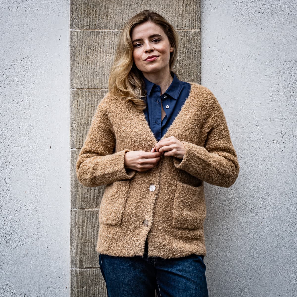 Diese weiche Strickjacke von Hemisphere verbindet luxuriöse Materialien mit gemütlicher Bouclé-Haptik. Mit ihrer voluminösen Oberfläche, dem tiefen V-Ausschnitt und den aufgesetzten Taschen wirkt sie gleichzeitig elegant und lässig. Die große Perlmuttknopfleiste verleiht dem Modell einen raffinierten Akzent, während der lockere Schnitt für ein angenehmes Tragegefühl sorgt. Ideal für kühle Tage – ob im Alltag oder als stilvolle Ergänzung für Layering-Looks.
