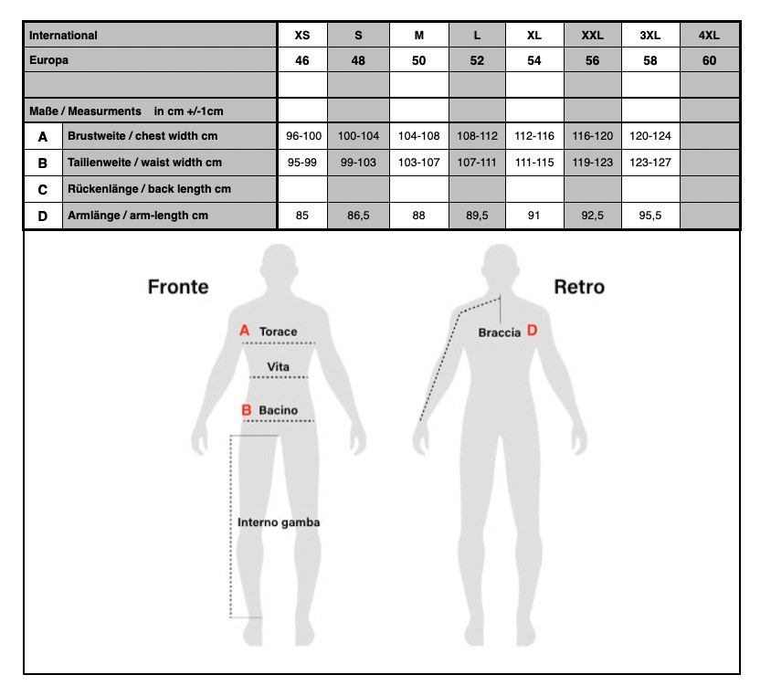 Nachbestellung und Anfertigung (auch mit Maßänderungen wie z. B. längere Rumpflänge) sind auf Anfrage möglich, bitte sprechen Sie uns hierzu direkt an. Anfertigungen sind vom Umtausch ausgeschlossen, wir bitten um Ihr Verständnis!