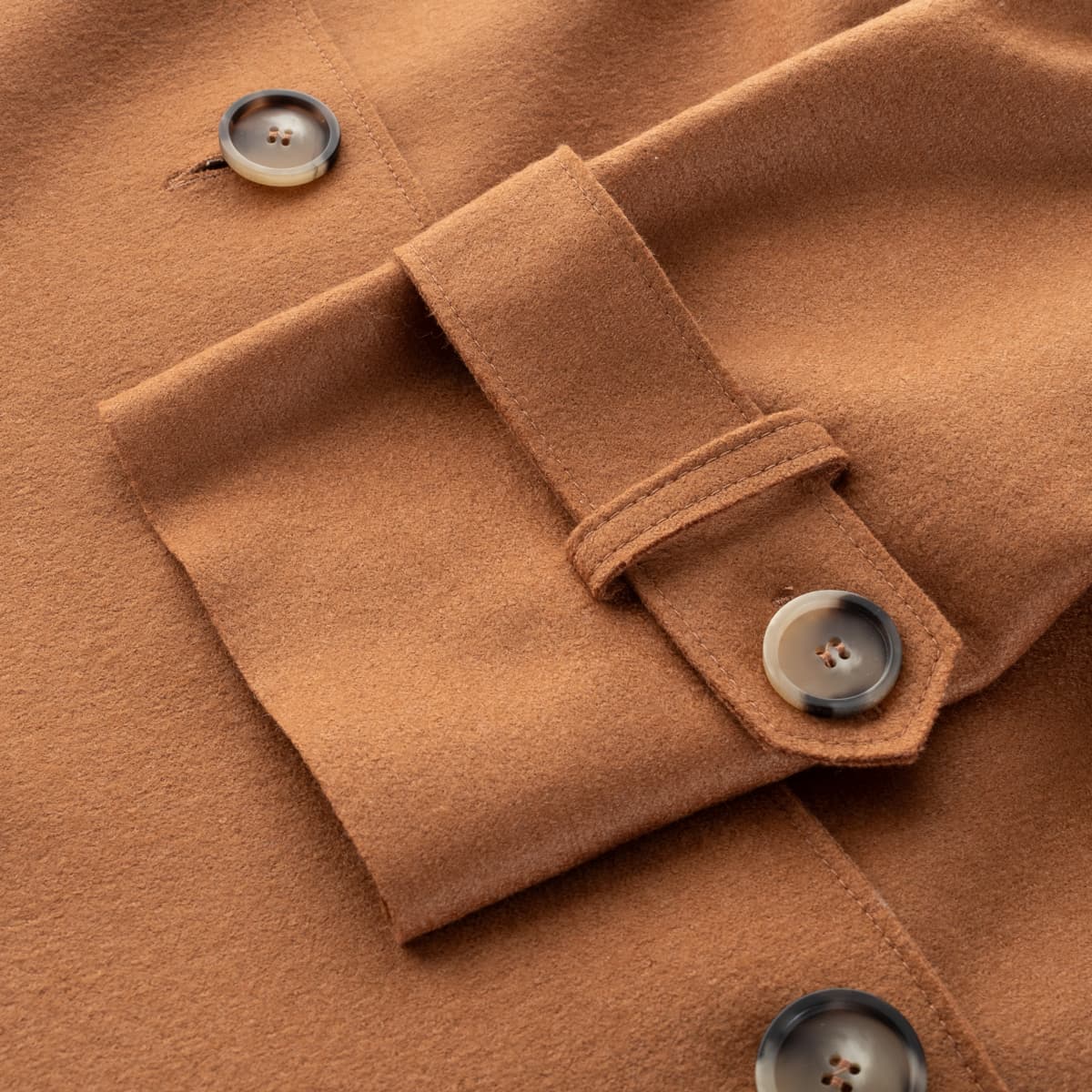 Cropped Trench Coat aus 100 % Schurwolle in Toffee von Harris Wharf. Eleganter, zweireihiger Kurzmantel mit Umlegekragen, seitlichen Eingrifftaschen und Riegeln an den Ärmelabschlüssen für klassischen Trench-Style mit moderner Länge.
