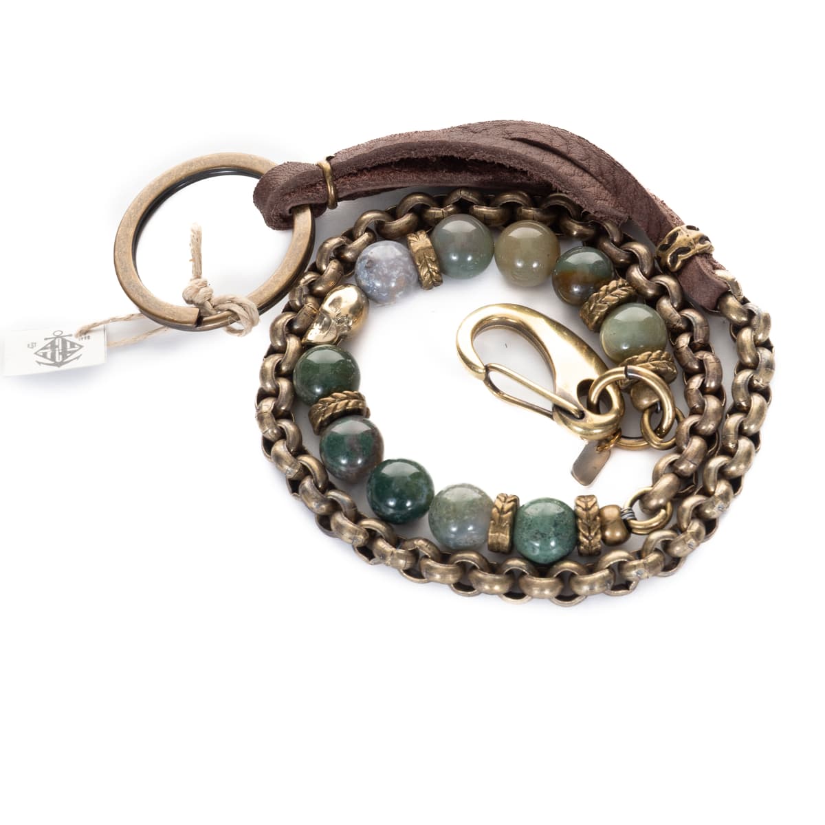 Die Wallet Chain "Ohio" von XXL Hardwear vereint Agatha, gealtertes Messing und Leder zu einem markanten Accessoire. Jedes Stück ist handgefertigt und besticht durch seinen individuellen Charakter. Alle Materialien sind mineralischer und natürlicher Herkunft. Aufgezogen auf einem doppelten Stahlseil – extrem reißfest und robust.