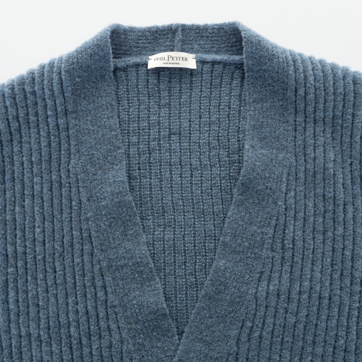 Der Flauschcardigan von Phil Petter überzeugt durch seine luxuriöse Haptik und handwerkliche Qualität. Gefertigt aus einem leichten Merino-Bouclé-Garn in Rippenstruktur, vereint er Wärme, Struktur und Weichheit in einem zeitlosen Design. Der Regular Fit sorgt für eine klassische Silhouette, während die markanten Knöpfe und der tiefe V-Ausschnitt den Look stilvoll abrunden. Ein Strickstück, das Komfort und Eleganz perfekt verbindet – hergestellt in Österreich.