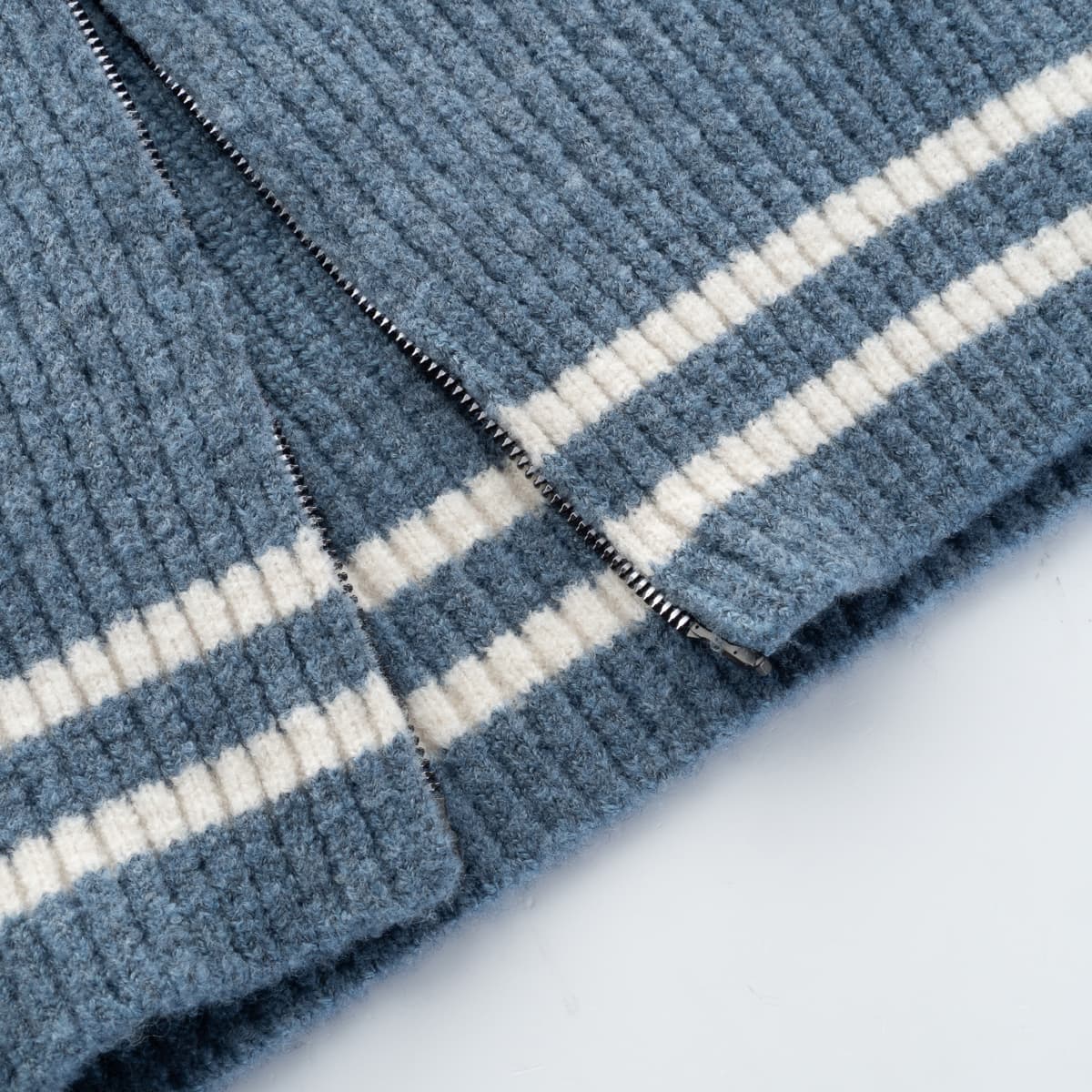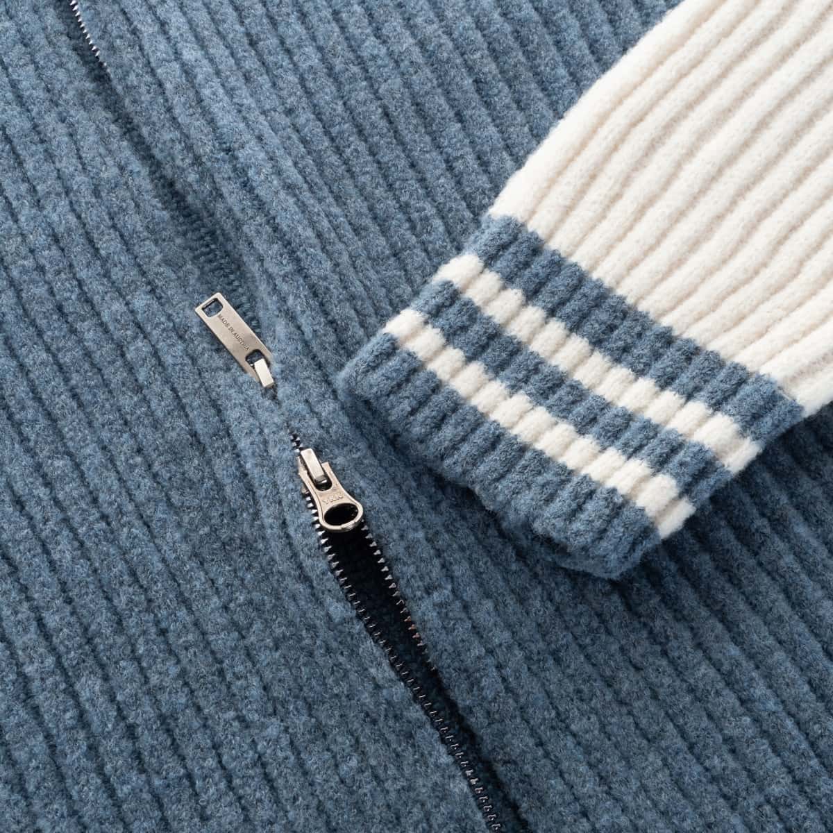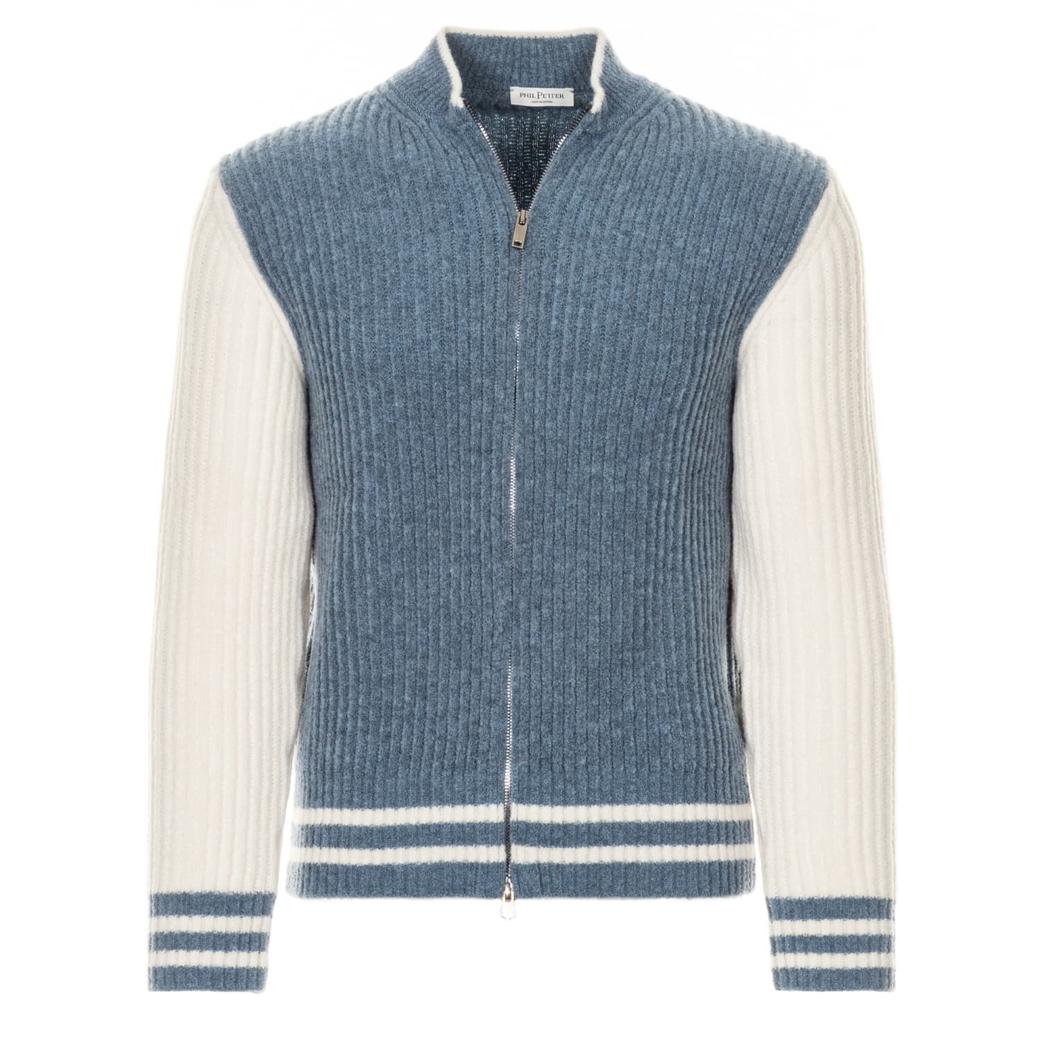 Die College-Strickjacke von Phil Petter verbindet sportliche Lässigkeit mit hochwertigem Strickhandwerk. Das Modell wird aus leichtem Merino-Bouclé-Garn in breiter Rippenstruktur gefertigt und bietet eine relaxte Passform mit markantem College-Flair. Außen zeigt sich die Jacke in strukturierter Bouclé-Haptik, während die Innenseite aus glatter Merinowolle für Stabilität und Komfort sorgt. Dank mehrfädigem Strickverfahren und hoher Strickfestigkeit bleibt die Form auch bei längerem Tragen stabil. Die effektvolle Linienführung an Schulter und Arm verleiht dem Modell Tiefe und Charakter. Ein Zwei-Wege-Reißverschluss in Metallux-Ausführung rundet das Design funktional ab. Gefertigt in Österreich.