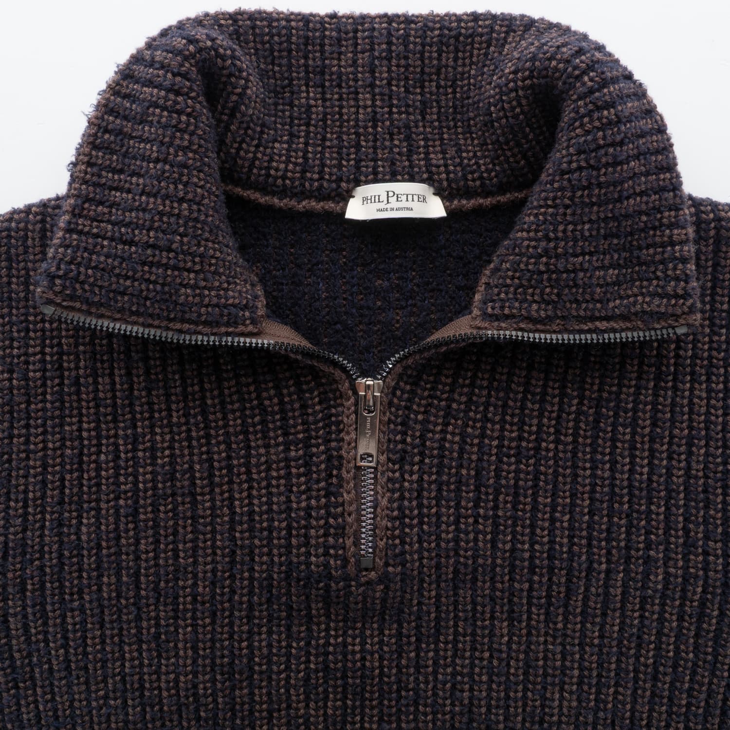 Der strukturierte Troyer von Phil Petter besticht durch seine markante Zweifarbigkeit und besondere Haptik. Die Kombination aus flauschigem Fake-Fur-Garn und glattem Kontrastgarn erzeugt eine effektvolle Optik mit Tiefe. Der Troyerkragen mit hochwertigem Metall-Zipper unterstreicht den sportiven Charakter, während die entspannte Passform für angenehmen Tragekomfort sorgt. Gestrickt aus mulesingfreier Merinowolle, steht das Modell für bewusste Qualität und nachhaltige Verarbeitung – gefertigt in Österreich.