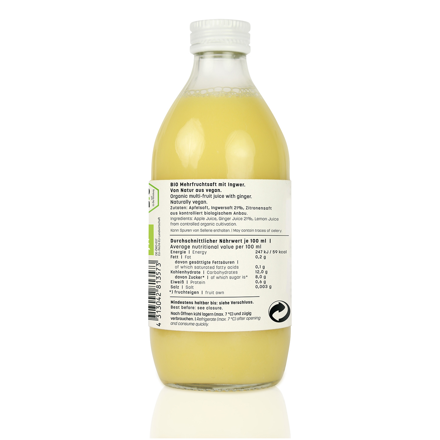 Zutaten: Apfelsaft 63%, Ingwersaft 21%, Zitronensaft 16% aus kontrolliert biologischem Anbau.