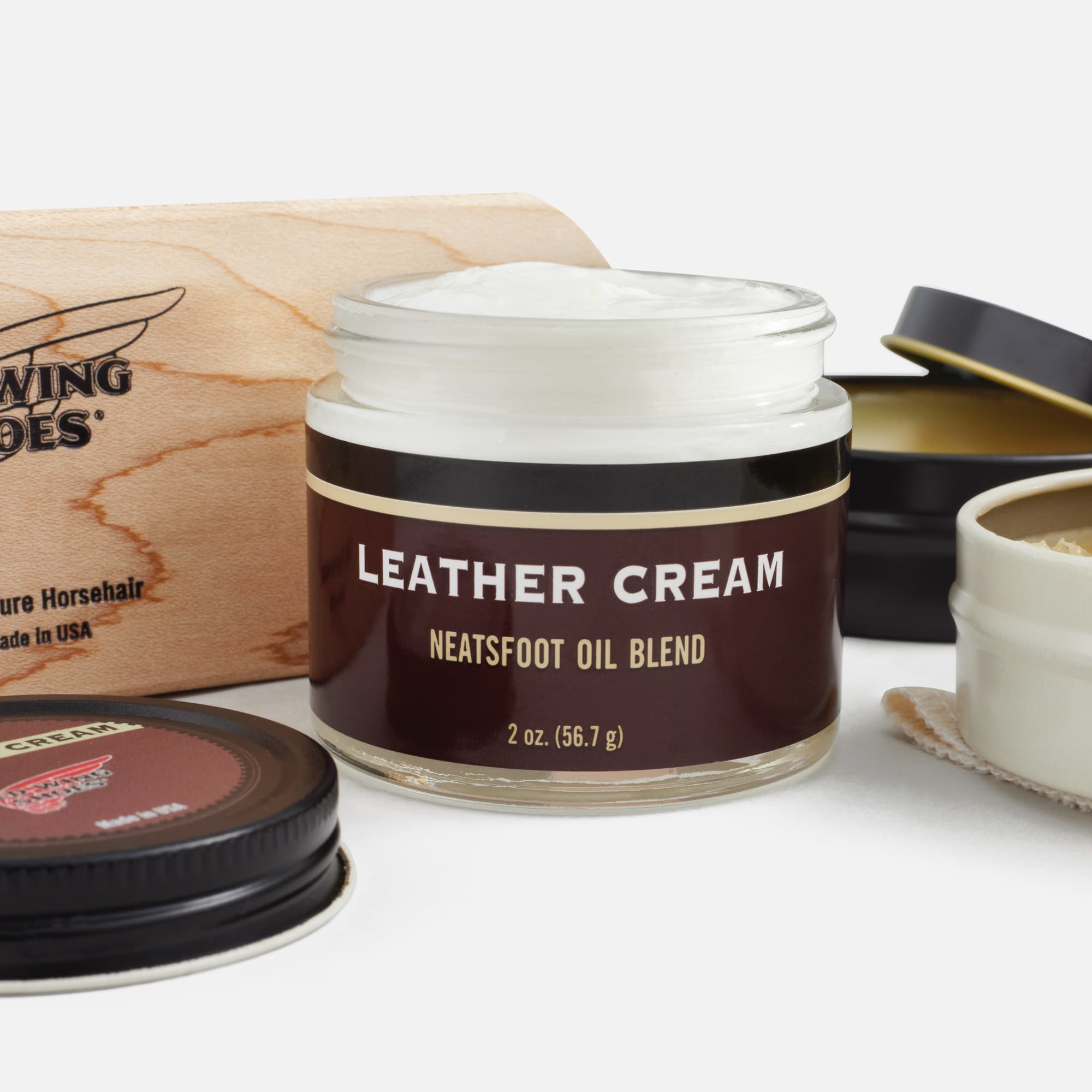 Die neutrale Red Wing Leather Cream dient der Pflege jedes Ledertypus. Die auf Klauenöl basierende Rezeptur verleiht schonend Feuchtigkeit ohne das Leder nachzudunkeln und verleiht dem Schuh einen polierten Glanz.