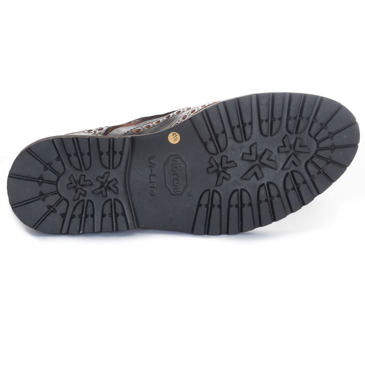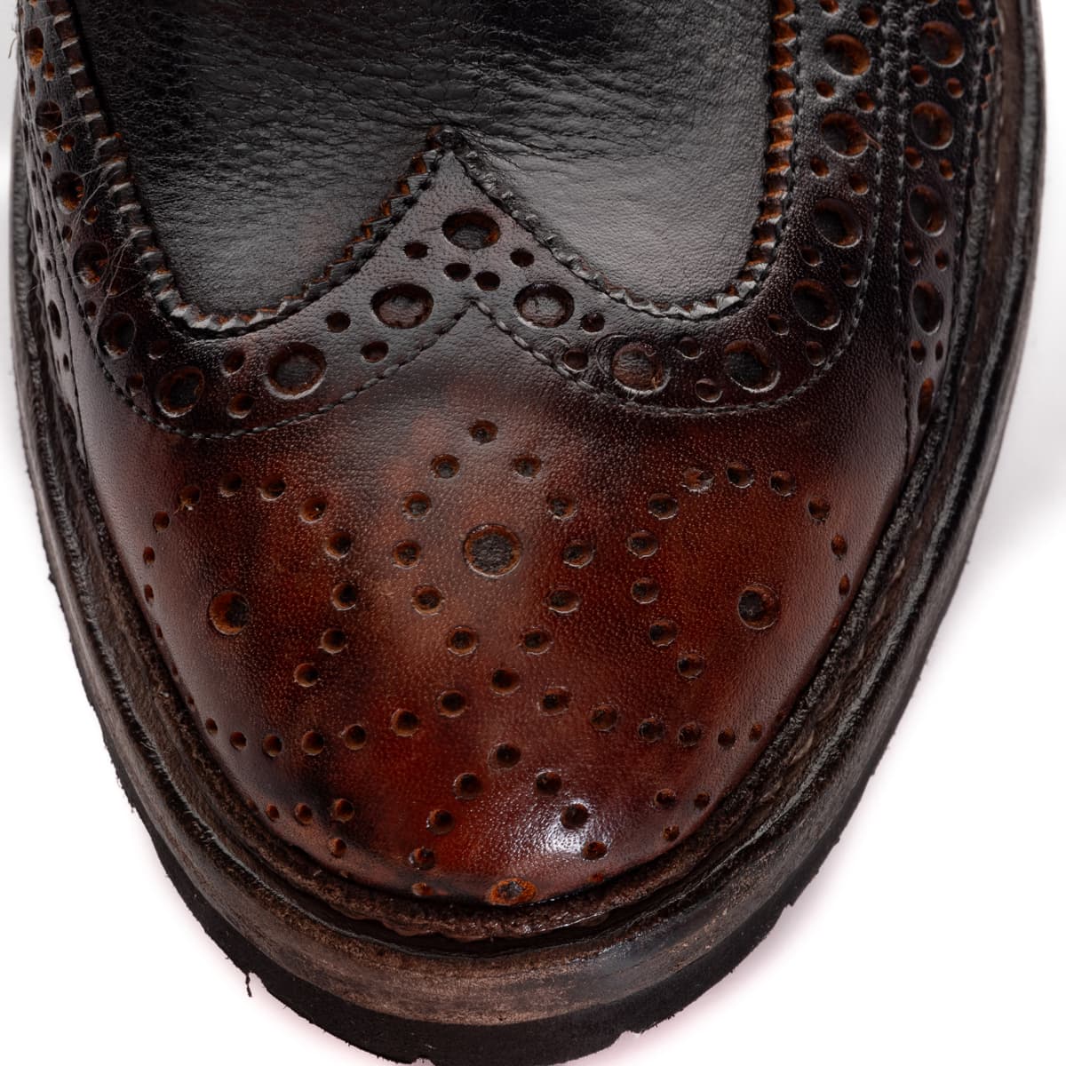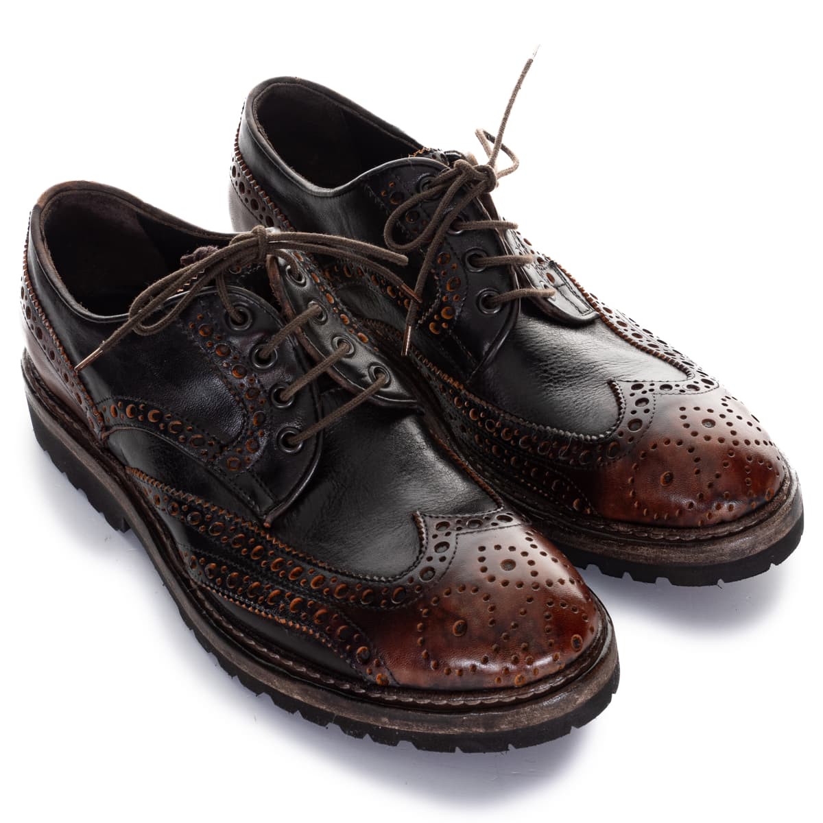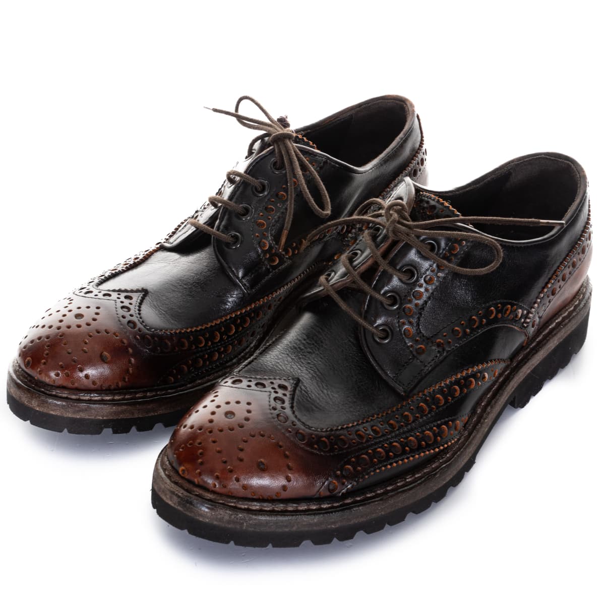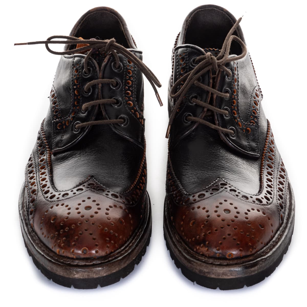 Exklusiver Halbschuh aus hochwertigem Kalbsleder in edlem Schwarz mit markantem Caos-Finish, das stilvolle Farbveränderungen an Schuhspitze und Ferse hervorhebt. Das tauchgefärbte Material wird durch einen Brogue an Vorder- und Hinterkappe akzentuiert. Durch das spezielle Färbeverfahren, sowie andere spezielle Behandlungstechniken (Wasch-, Färbetechniken), ist jedes Exemplar einzigartig. Aufgrund dessen, individueller Handarbeit und der Naturbedingtheit der Materialien, können die Farben, Prägung und Struktur abweichen. Jedes Exemplar ist einzigartig und ein echtes Unikat, gefertigt in liebevoller Handarbeit.
