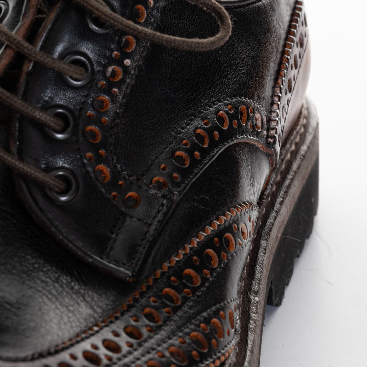 Im ‚stone washed‘ - Prozess gewinnen die Schuhe, die mit abrasiven Steinen behandelt werden, einen authentischen Vintage-Look. Beim abschließenden Finish wird die einzigartige Charakteristik – die Verläufe und Schattierungen – herausgearbeitet. Die Verwendung von erstklassigem Pferde-, Elch-, Antilopen- und Kalbsleder, in Verbindung mit besten italienischen Ledersohlen, lassen ein Unikat feinster Qualität entstehen.