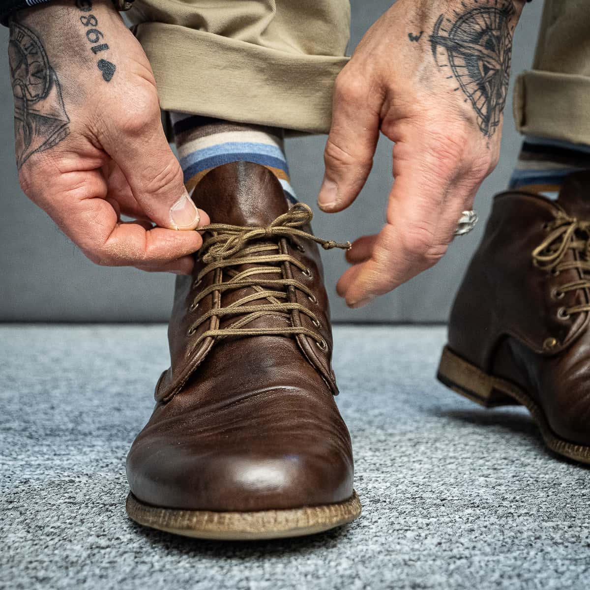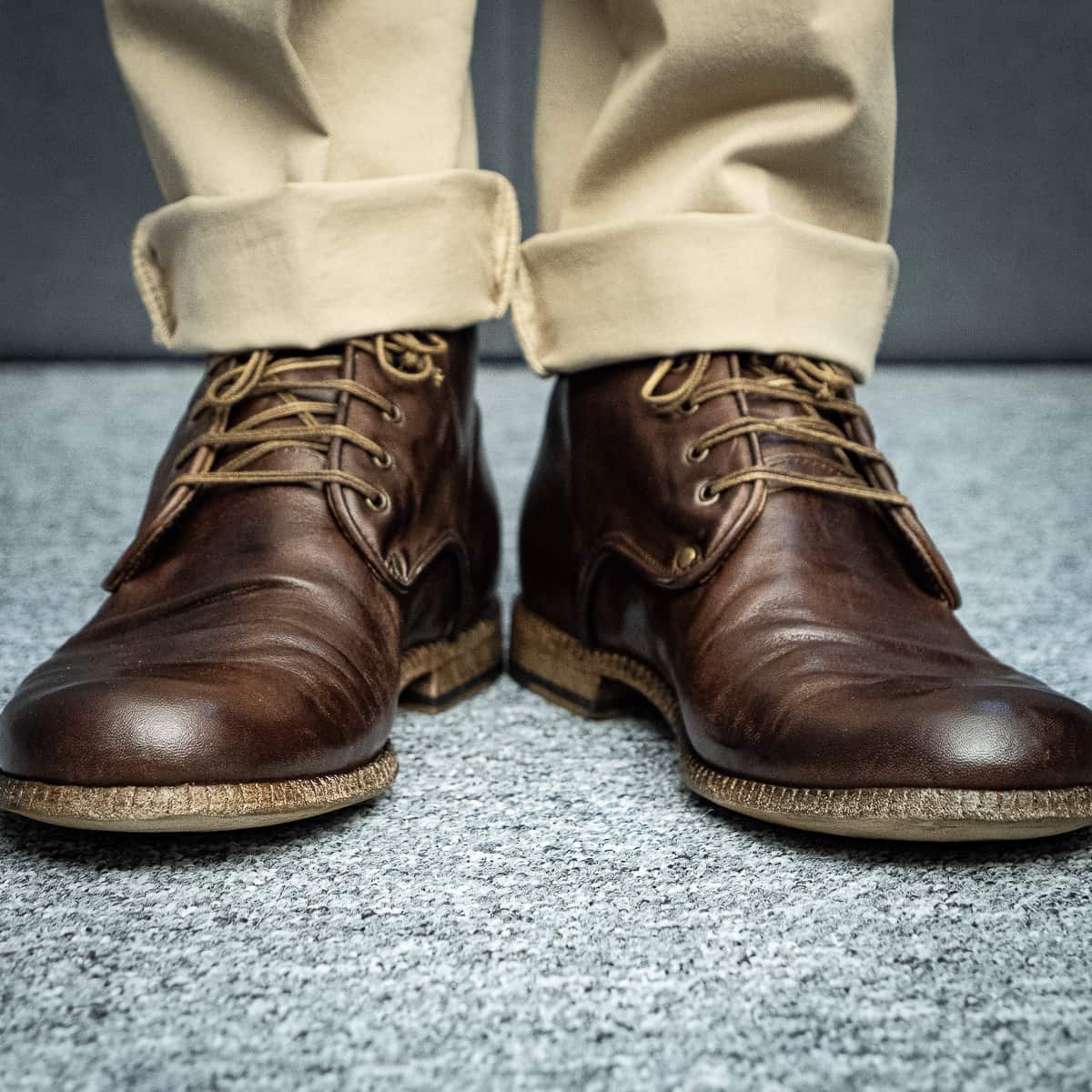 Im ‚stone washed‘ - Prozess gewinnen die Schuhe, die mit abrasiven Steinen behandelt werden, einen authentischen Vintage-Look. Beim abschließenden Finish wird die einzigartige Charakteristik – die Verläufe und Schattierungen – herausgearbeitet. Die Verwendung von erstklassigem Pferde-, Elch-, Antilopen- und Kalbsleder, in Verbindung mit besten italienischen Ledersohlen, lassen ein Unikat feinster Qualität entstehen.