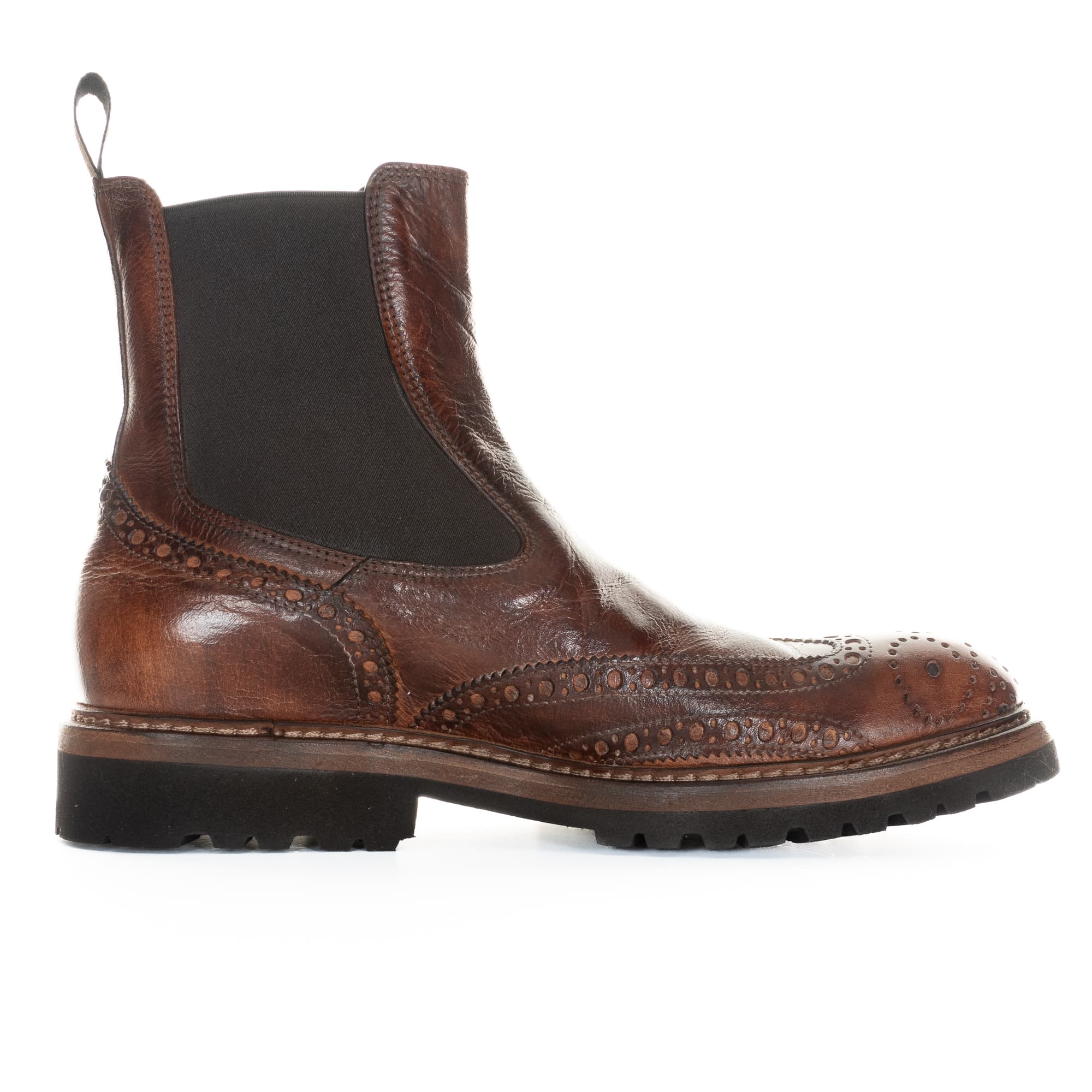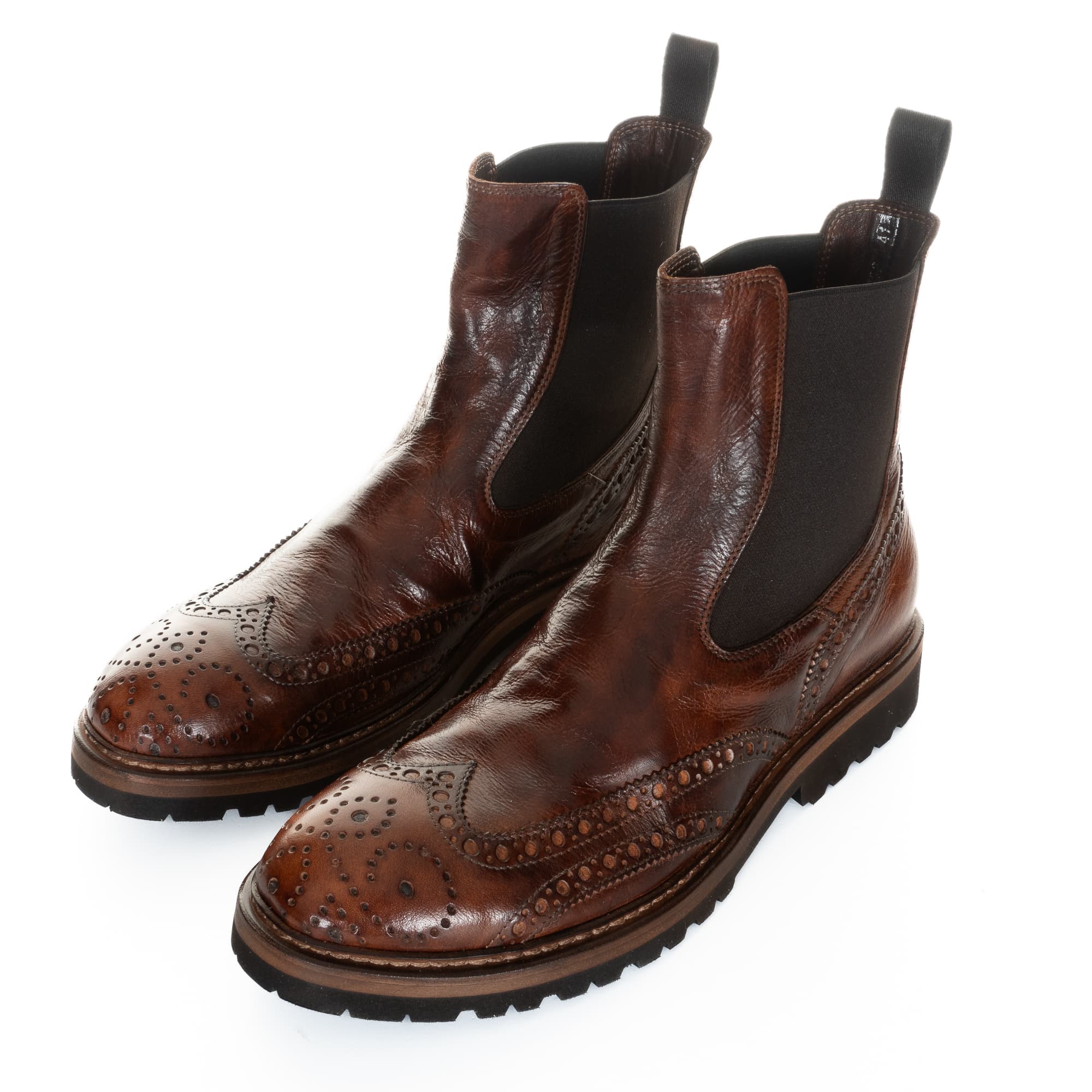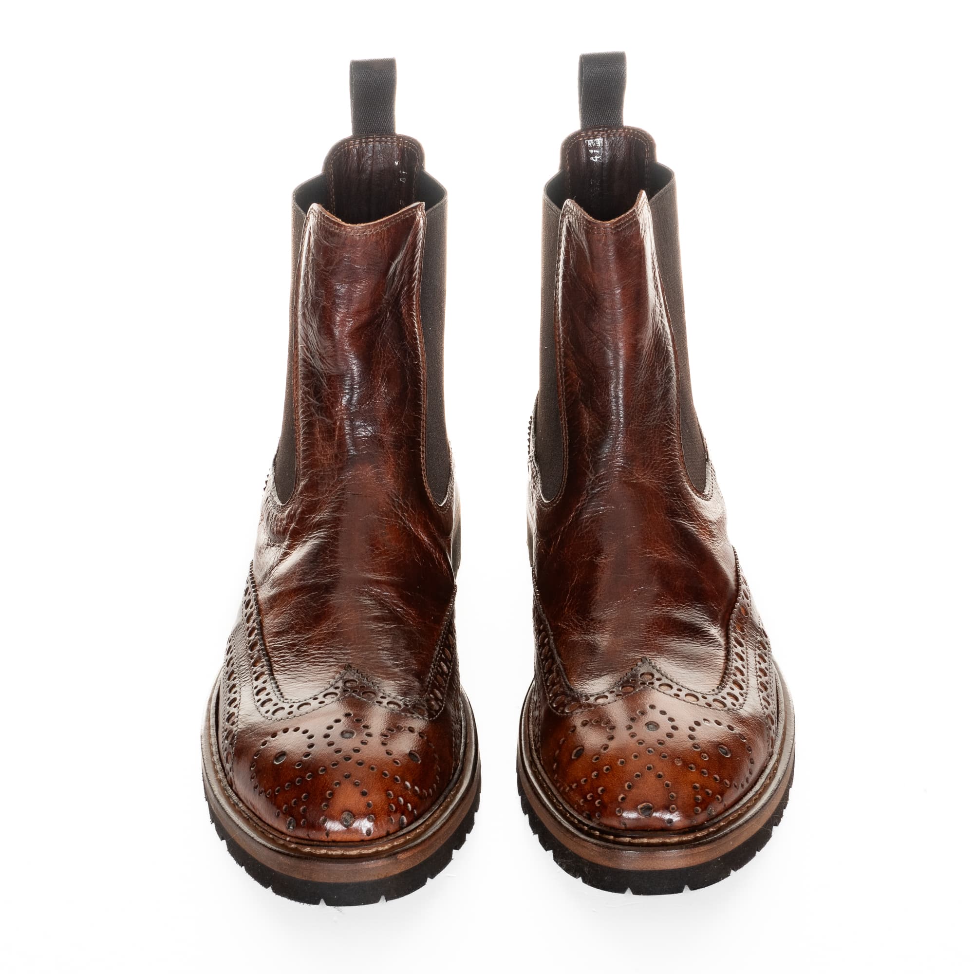 Exklusiver Chelsea Boot aus hochwertigem Büffelleder in edlem Braun mit markantem Caos-Finish, das stilvolle Farbveränderungen an Schuhspitze und Ferse hervorhebt. Der Schuh wird durch einen Brogue an Vorder- und Hinterkappe akzentuiert. Für hohen Tragekomfort sorgen eine praktische Zuglasche am Schaft sowie seitliche Stretch-Einsätze. Ausgestattet mit einer leichten und robusten Vibram Vi-Lite Sohle bietet der Schuh optimalen Halt und Flexibilität. Präzise gefertigt in Italien. Hinweis: Der Schuh fällt ca. eine Nummer größer aus – bei Größe 43 wird Größe 42 empfohlen.