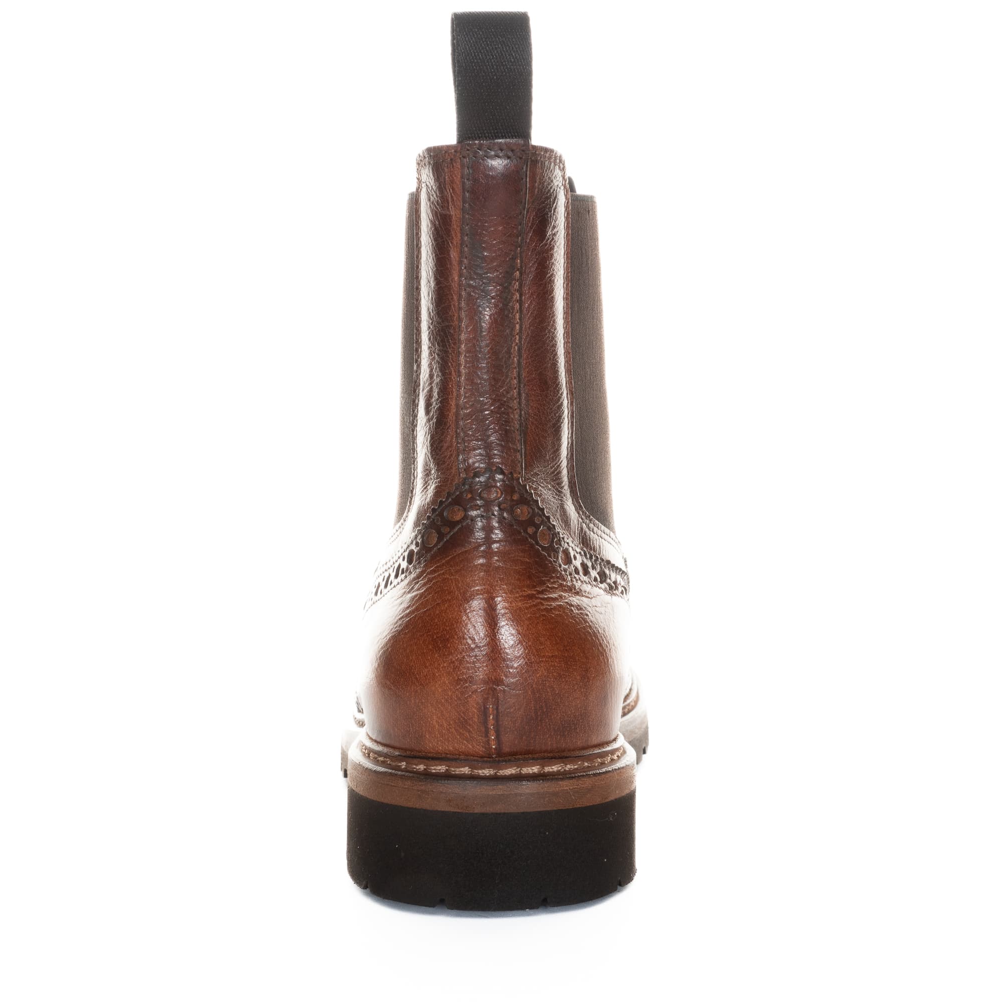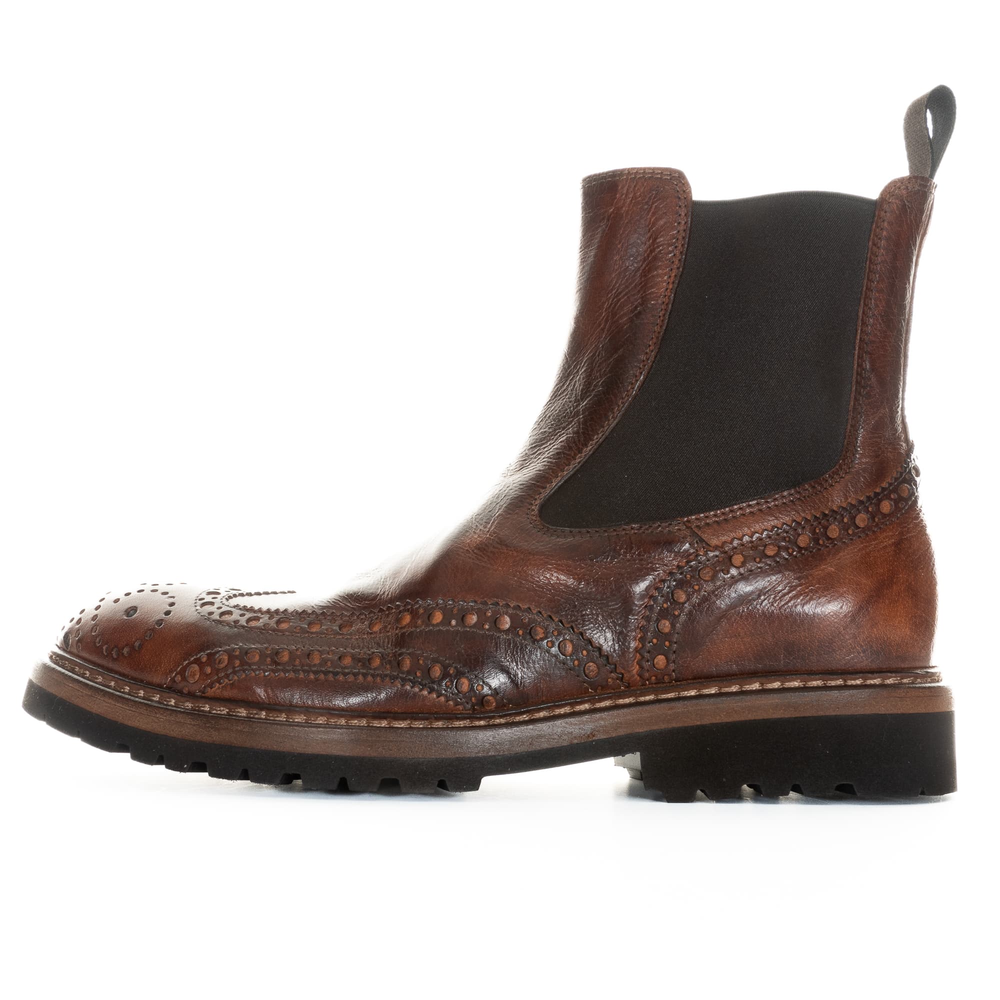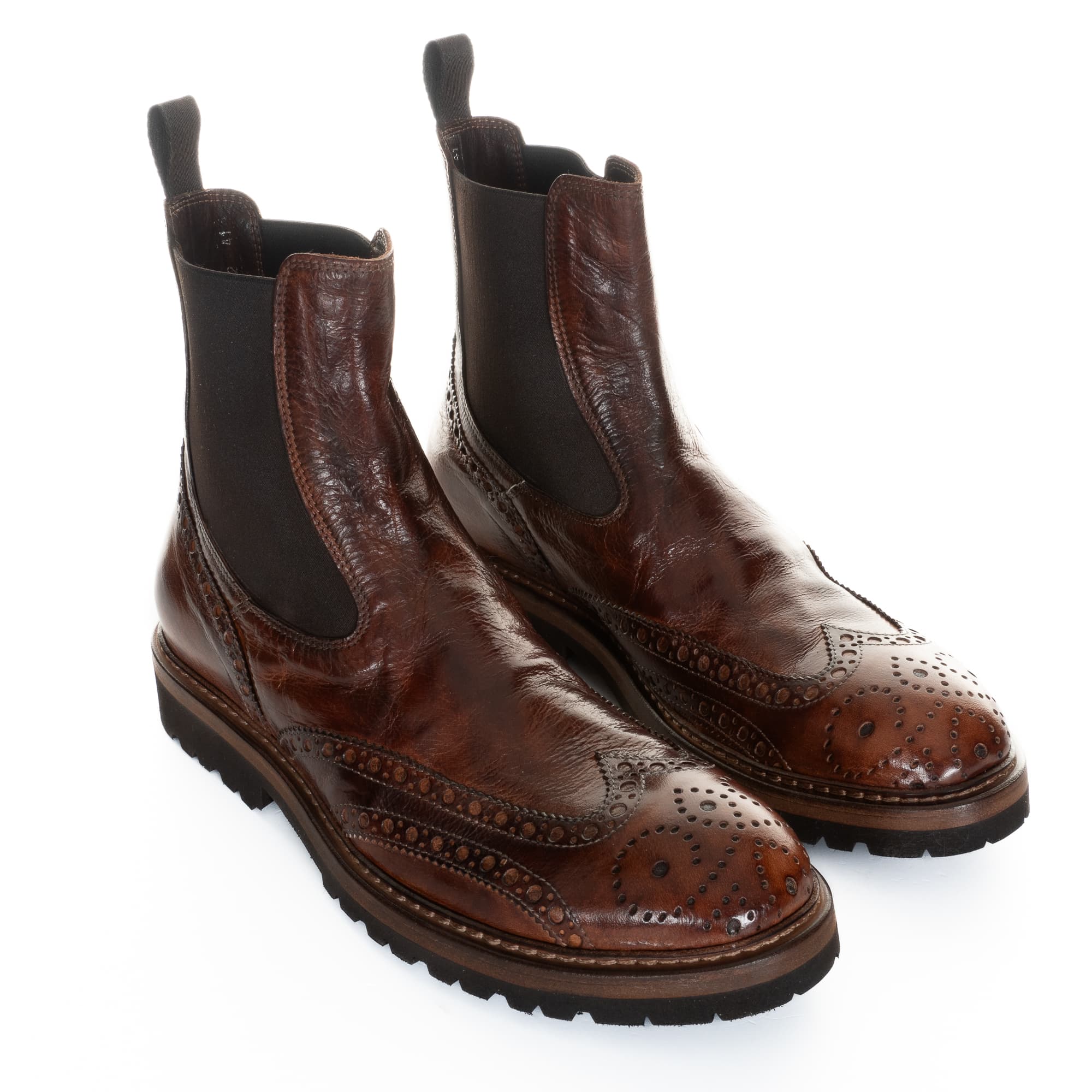 Exklusiver Chelsea Boot aus hochwertigem Büffelleder in edlem Braun mit markantem Caos-Finish, das stilvolle Farbveränderungen an Schuhspitze und Ferse hervorhebt. Der Schuh wird durch einen Brogue an Vorder- und Hinterkappe akzentuiert. Für hohen Tragekomfort sorgen eine praktische Zuglasche am Schaft sowie seitliche Stretch-Einsätze. Ausgestattet mit einer leichten und robusten Vibram Vi-Lite Sohle bietet der Schuh optimalen Halt und Flexibilität. Präzise gefertigt in Italien. Hinweis: Der Schuh fällt ca. eine Nummer größer aus – bei Größe 43 wird Größe 42 empfohlen.
