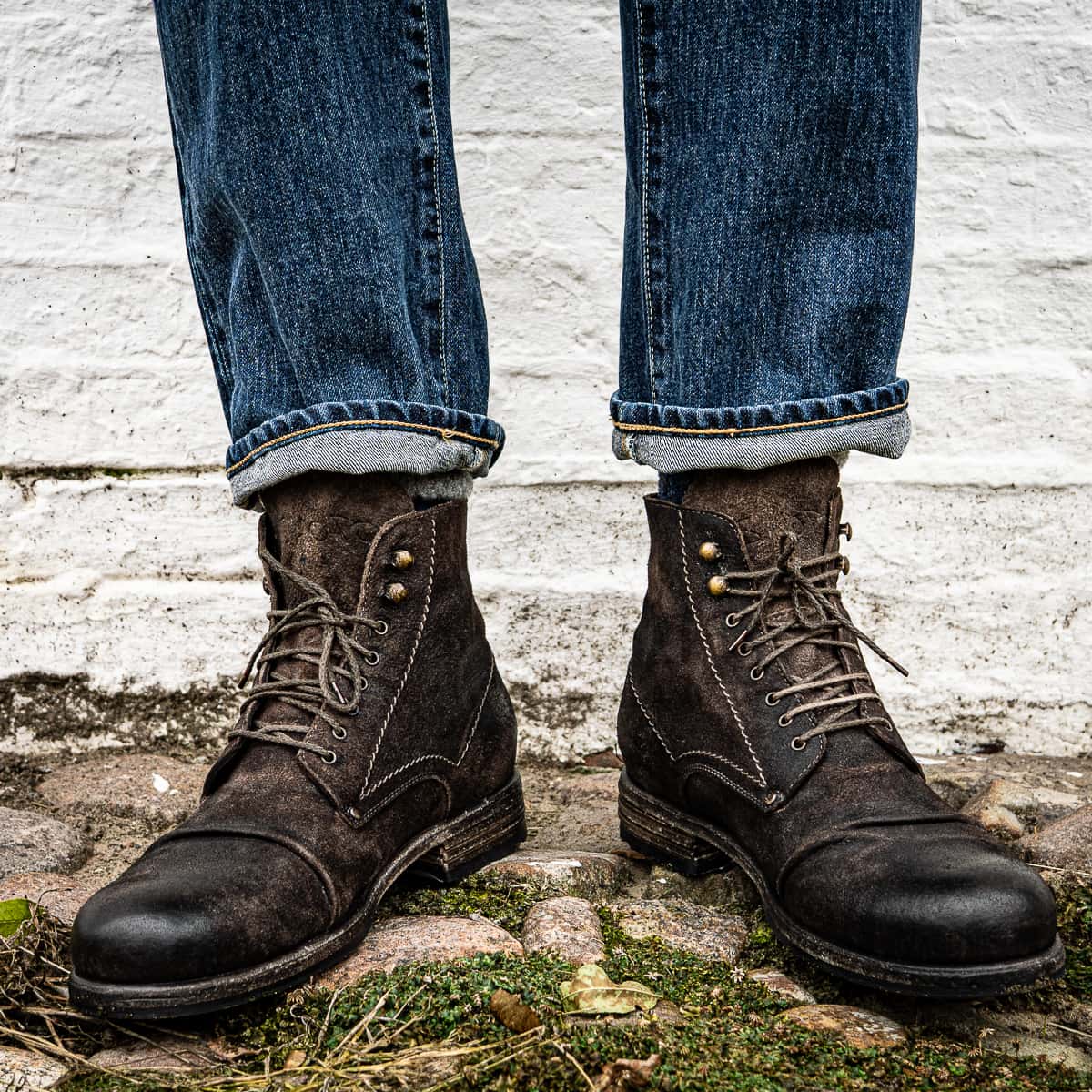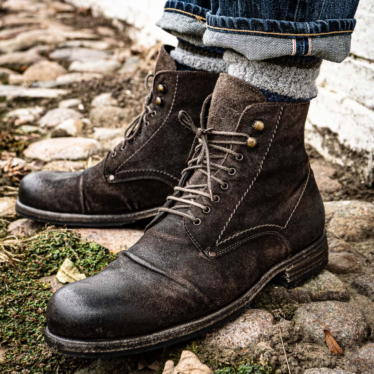 Im ‚stone washed‘ - Prozess gewinnen die Schuhe, die mit abrasiven Steinen behandelt werden, einen authentischen Vintage-Look. Beim abschließenden Finish wird die einzigartige Charakteristik – die Verläufe und Schattierungen – herausgearbeitet. Die Verwendung von erstklassigem Pferde-, Elch-, Antilopen- und Kalbsleder, in Verbindung mit besten italienischen Ledersohlen, lassen ein Unikat feinster Qualität entstehen.
