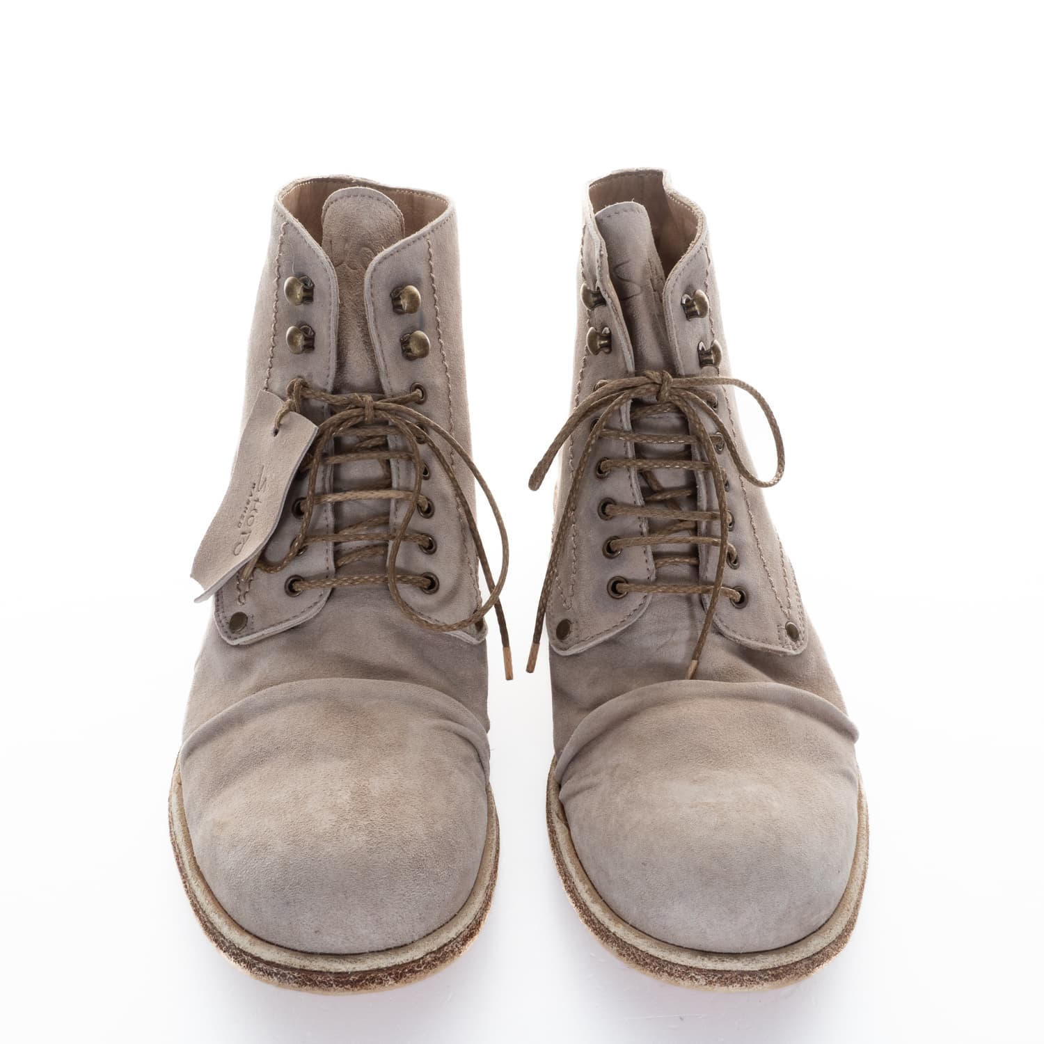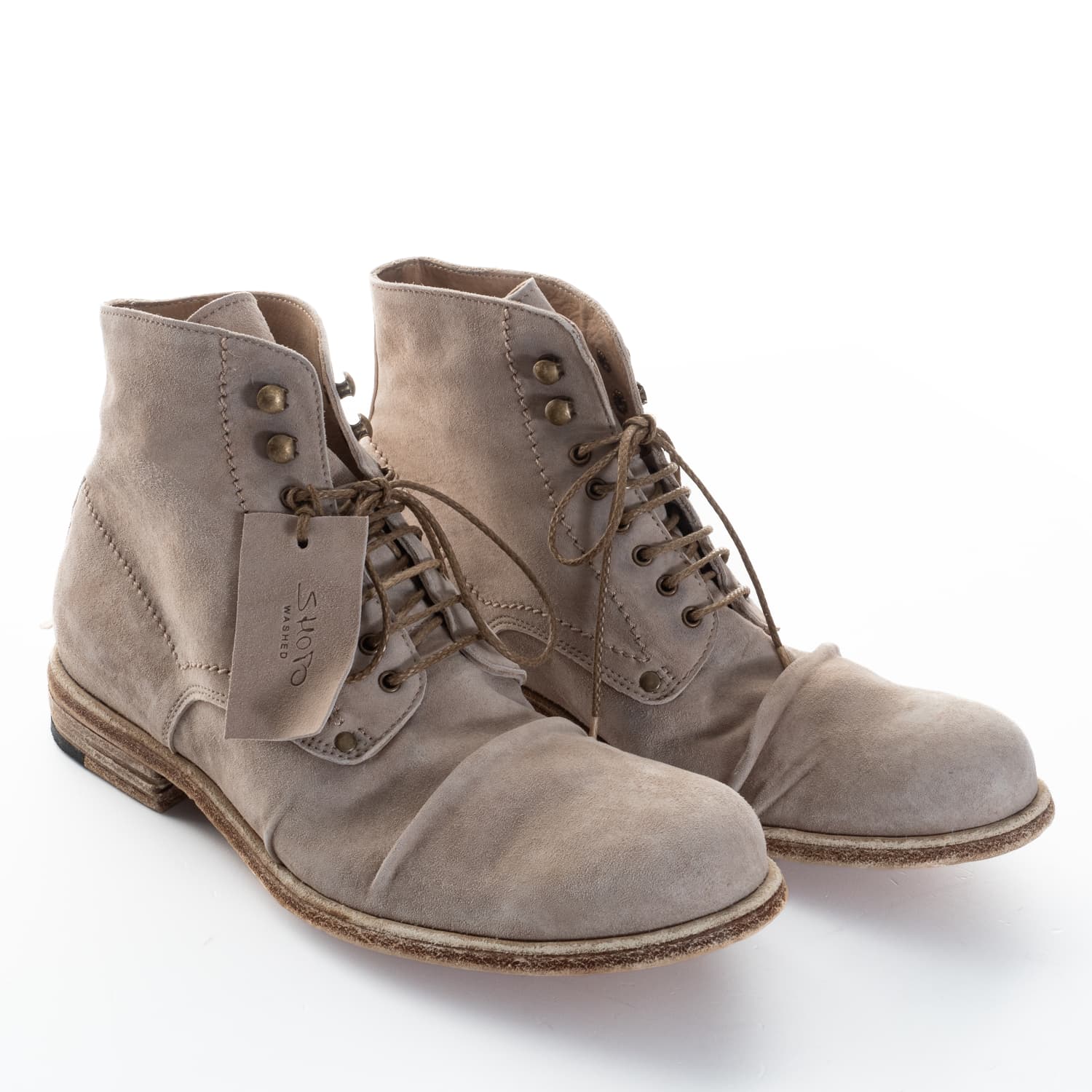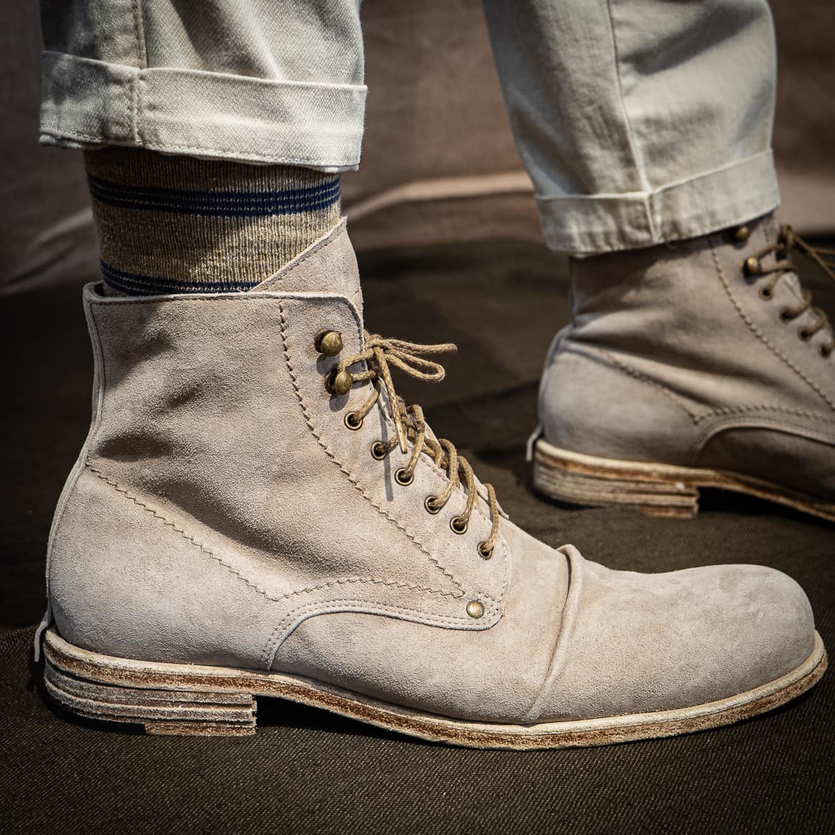Im ‚stone washed‘ - Prozess gewinnen die Schuhe, die mit abrasiven Steinen behandelt werden, einen authentischen Vintage-Look. Beim abschließenden Finish wird die einzigartige Charakteristik – die Verläufe und Schattierungen – herausgearbeitet. Die Verwendung von erstklassigem Pferde-, Elch-, Antilopen- und Kalbsleder, in Verbindung mit besten italienischen Ledersohlen, lassen ein Unikat feinster Qualität entstehen.