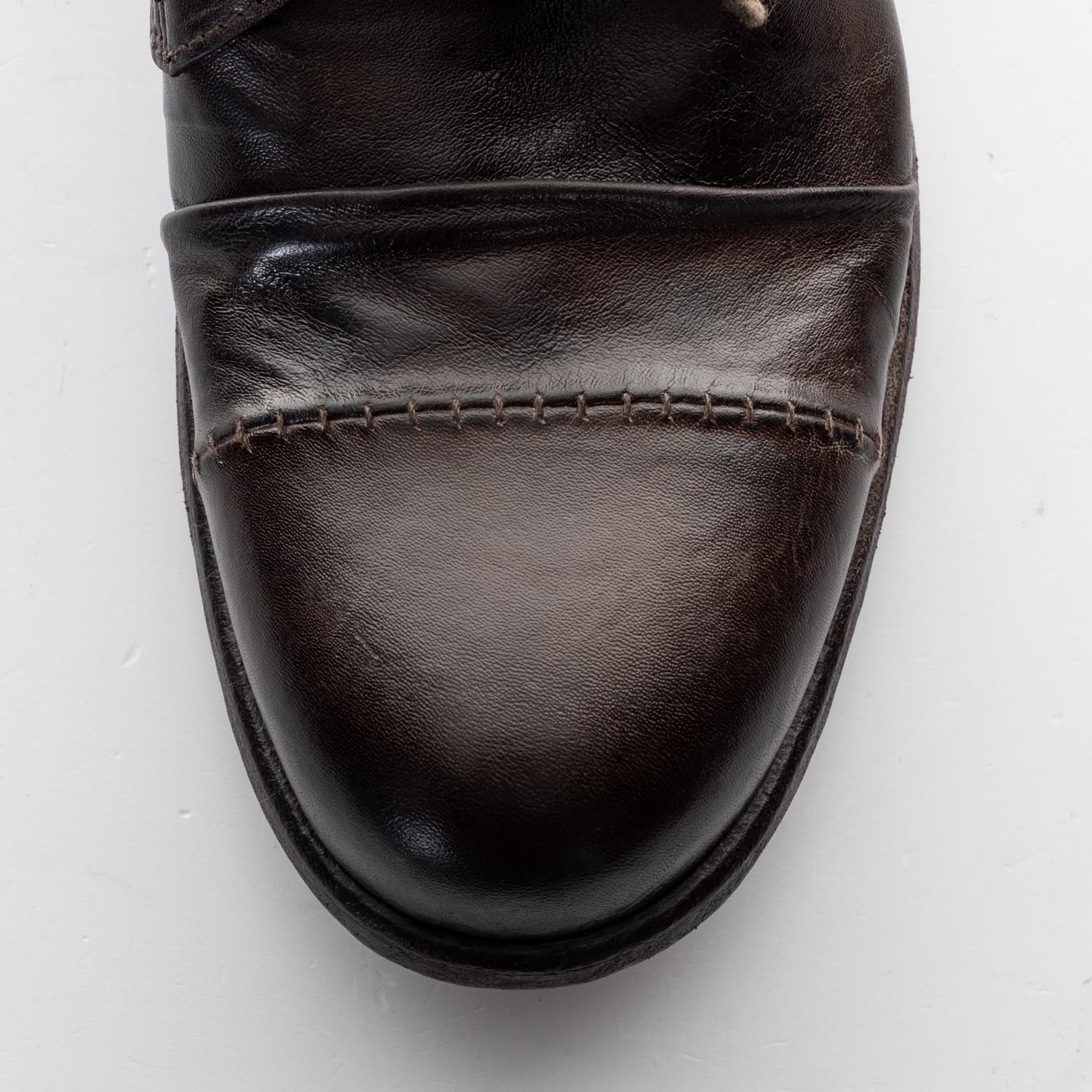 Im ‚stone washed‘ - Prozess gewinnen die Schuhe, die mit abrasiven Steinen behandelt werden, einen authentischen Vintage-Look. Beim abschließenden Finish wird die einzigartige Charakteristik – die Verläufe und Schattierungen – herausgearbeitet. Die Verwendung von erstklassigem Pferde-, Elch-, Antilopen- und Kalbsleder, in Verbindung mit besten italienischen Ledersohlen, lassen ein Unikat feinster Qualität entstehen.