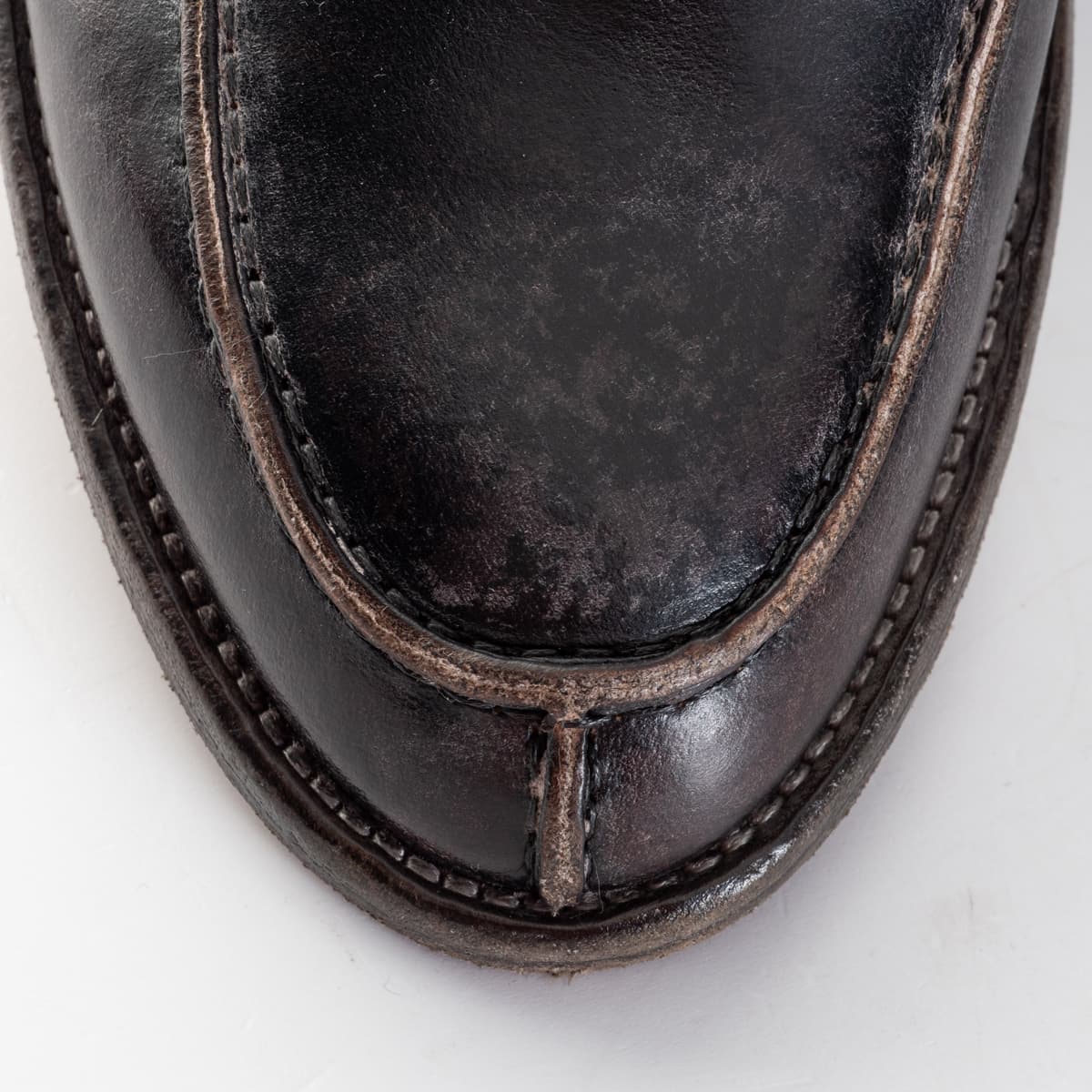 Die markante Mokassin-Naht, der schlichte Riegel sowie die bewusst rustikale Lederlaufsohle verleihen dem Modell eine zeitlose, leicht rohe Ästhetik. Ein vielseitiger Begleiter, der sowohl zu Denim als auch zu gepflegten Casual-Looks überzeugt.
