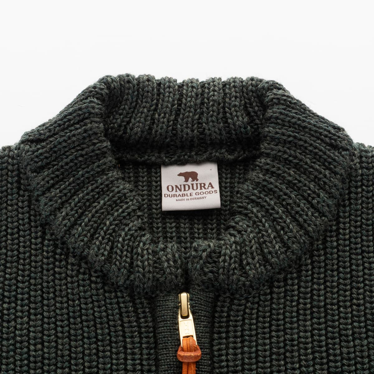 Der Classic Cardigan von Ondura Durable Goods ist ein echtes Statement für funktionale Qualität und zeitloses Design. Gestrickt aus 100 % Wolle (Merinowolle), überzeugt er durch seine natürliche Wärmeleistung, Atmungsaktivität und antibakteriellen Eigenschaften. Die grobe Struktur im Perlfangmuster und der robuste Zwei-Wege-Zipper von YKK unterstreichen den handwerklichen Anspruch. Der Kragen ist leicht erhöht und schützt zuverlässig vor Wind, während ein kleines Lederpatch mit geprägtem Bärenlogo am linken Ärmel ein dezentes Markendetail setzt. Hergestellt in Deutschland – für kalte Tage, Outdoor-Aktivitäten und als ideale zweite Schicht unter einer Lederjacke.