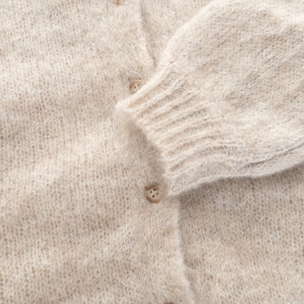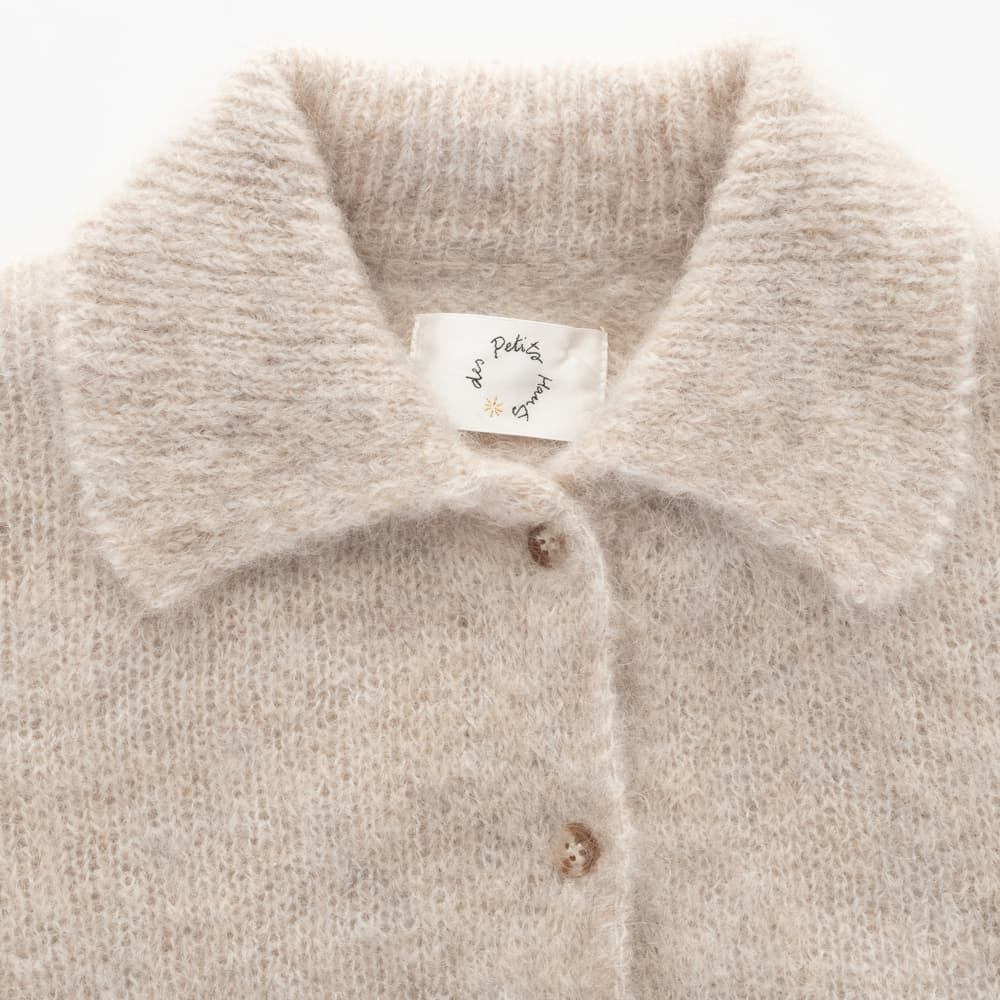 Sehr flauschige Strickjacke von Des Petits Hauts aus einer hochwertigen Garnmischung mit hohem Kid-Mohair-Anteil. Der weiche, voluminöse Strick sorgt für eine angenehm leichte Haptik und ein wärmendes Tragegefühl. Der fein ausgearbeitete Kragen verleiht der Strickjacke eine feminine, leicht verspielte Note, während die klassische Knopfleiste den zeitlosen Charakter unterstreicht. Ein vielseitiges Lieblingsstück für stilvolle Alltagslooks.