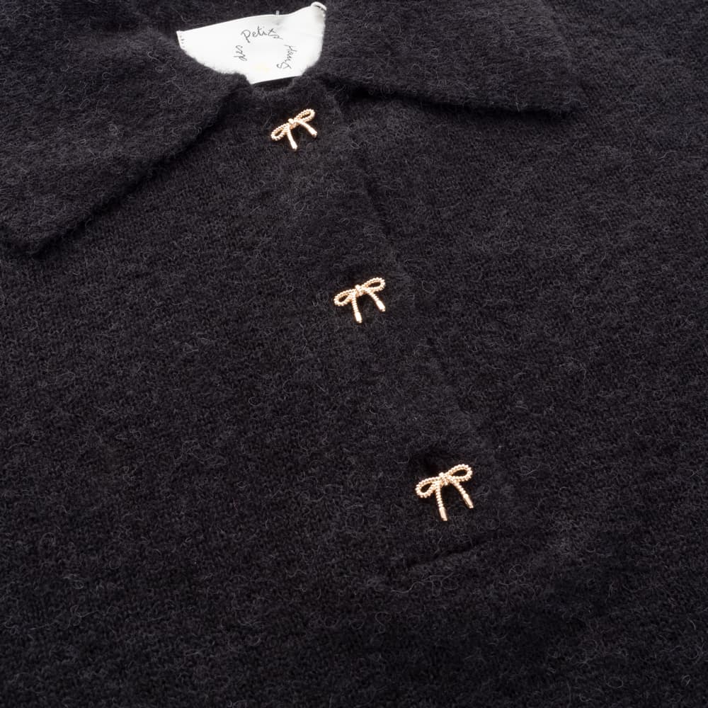 Flauschiges Damen-Strickshirt aus einer hochwertigen Garnmischung von Des Petits Hauts. Das Shirt besticht durch seinen weichen, flauschigen Strick, einen klassischen Kragen und zarte Schleifen-Knopfdetails in goldener Optik. Die raffinierte Strickart verleiht diesem Modell einen edlen Look und gleichzeitig ein komfortables, leichtes Tragegefühl.