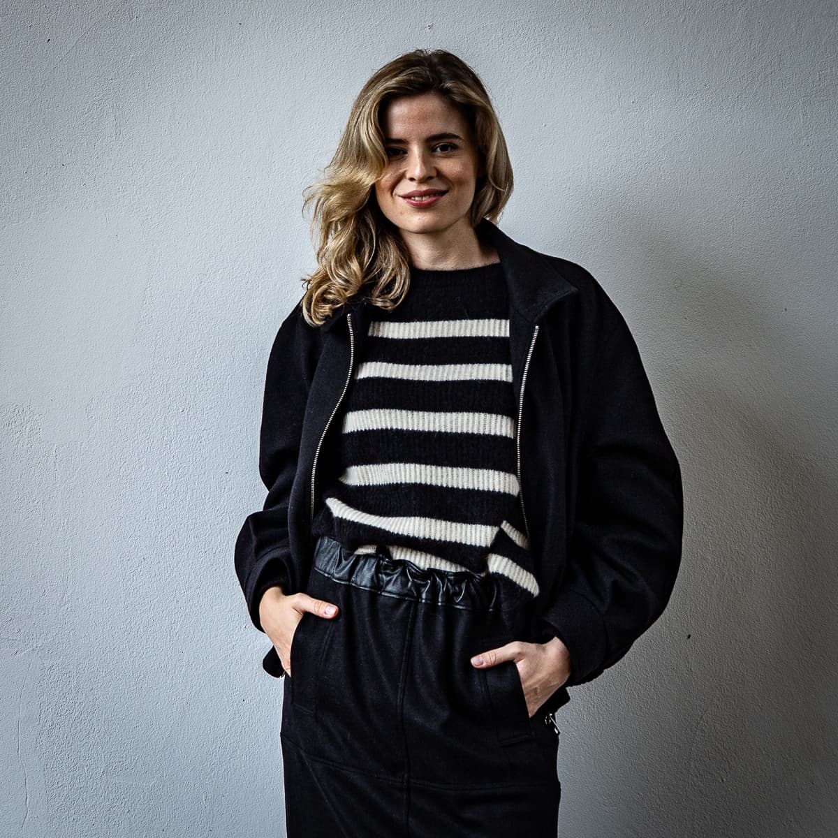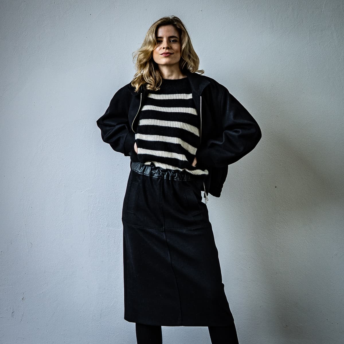 Dieser luxuriöse Strickpullover von Majestic Filatures besticht durch seine außergewöhnlich flauschige Haptik und den modischen Streifen-Look. Gefertigt aus einem edlen Materialmix mit hohem Wollanteil und 40 % Fuchshaar, bietet der Pullover ein besonders weiches, warmes Tragegefühl. Der moderne Streifenverlauf in Schwarz und Natur sowie das farblich abgesetzte Rückenteil machen ihn zum stilvollen Blickfang. Hergestellt in Portugal, steht dieses Modell für zeitloses Design und handwerkliche Qualität.