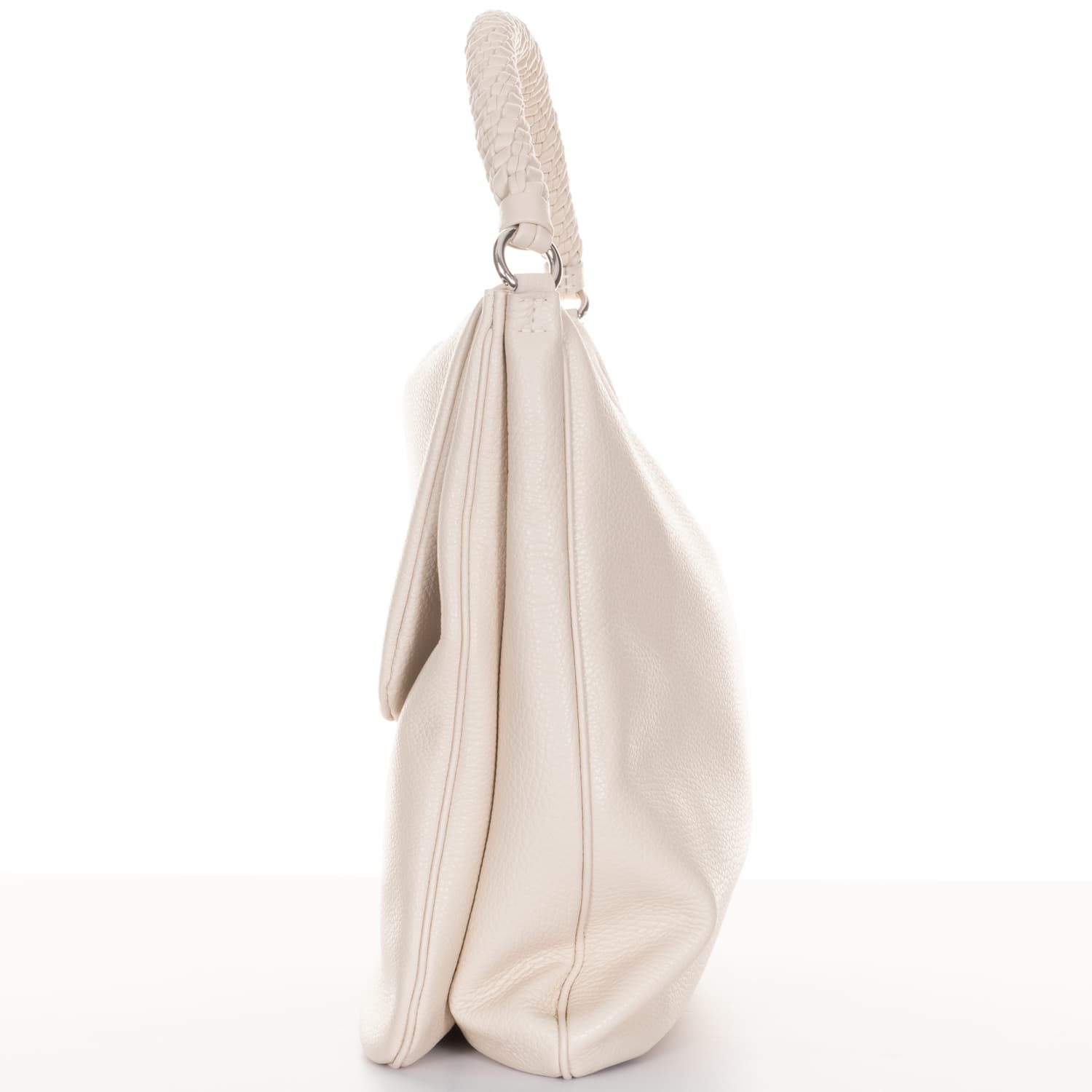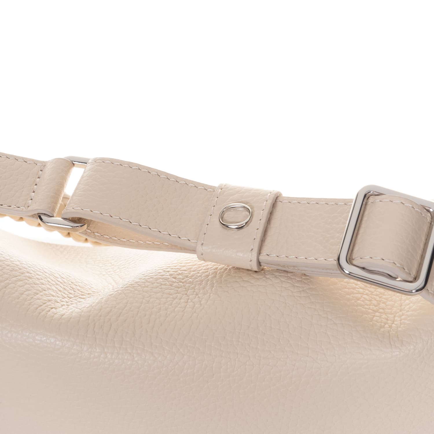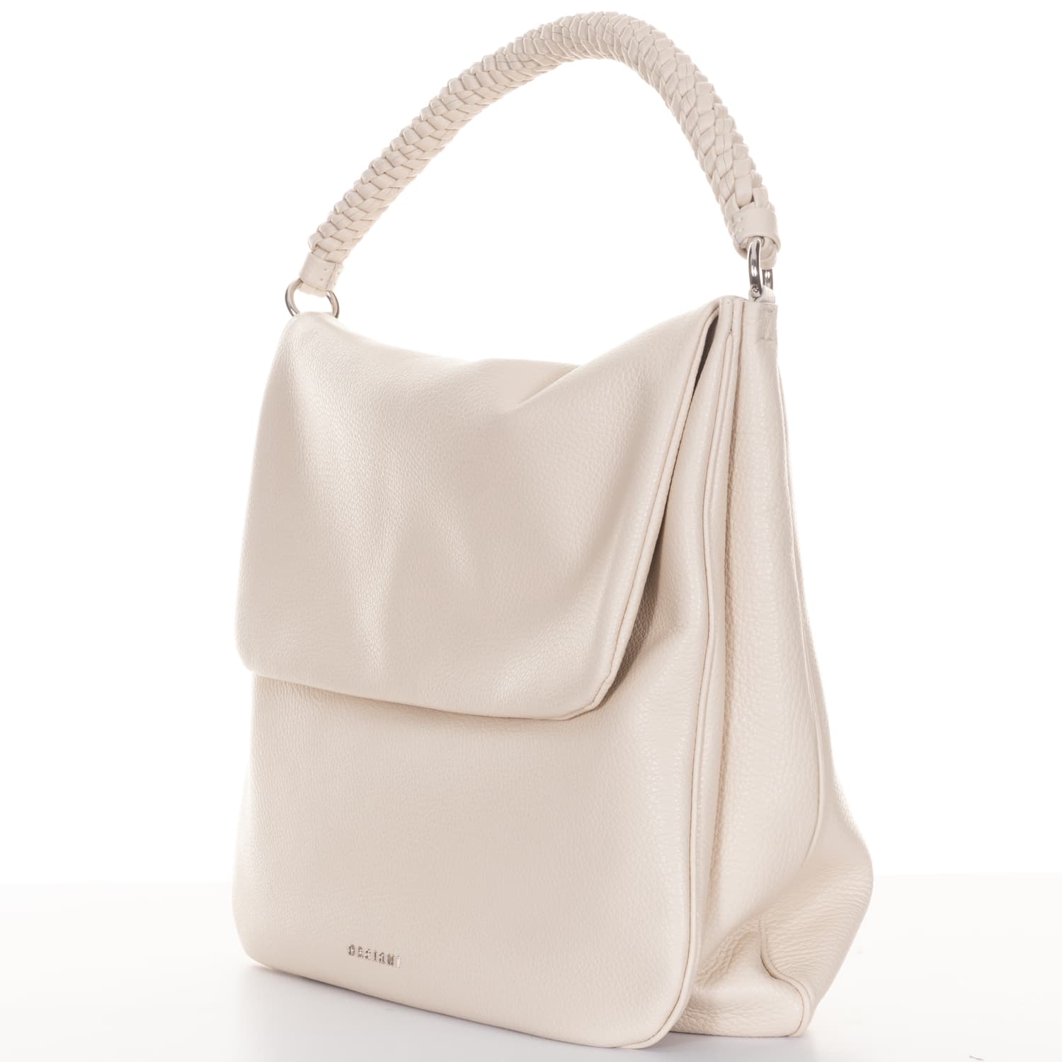 Die Orciani Diana Handtasche in einem sanften Beige überzeugt mit ihrer femininen Eleganz und einem Hauch von lässigem Luxus. Gefertigt aus feinstem, genarbtem Leder, zeigt sich die Tasche in einer weichen, leicht fließenden Form, die durch den geflochtenen Henkel ein charmantes Detail erhält.