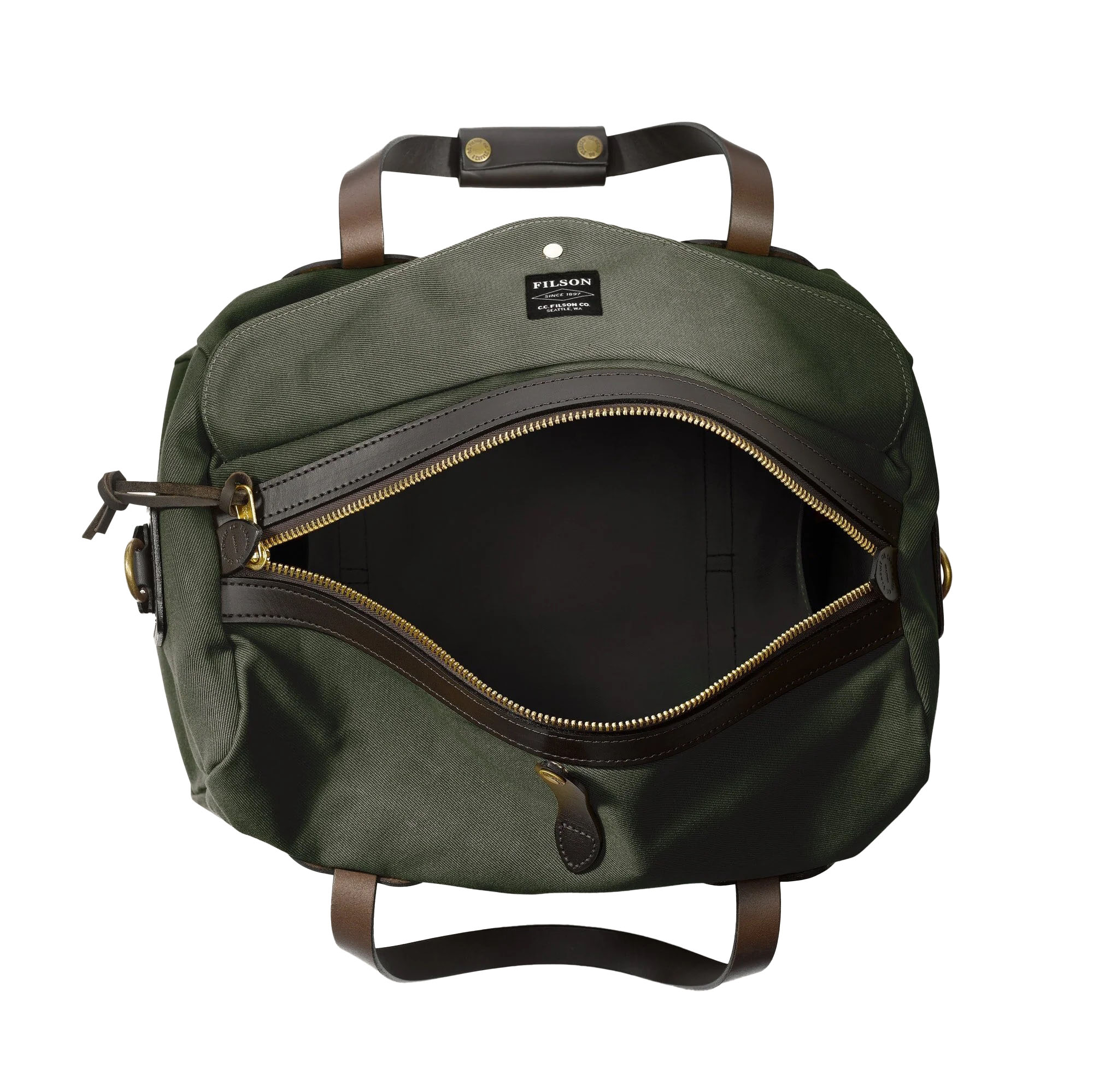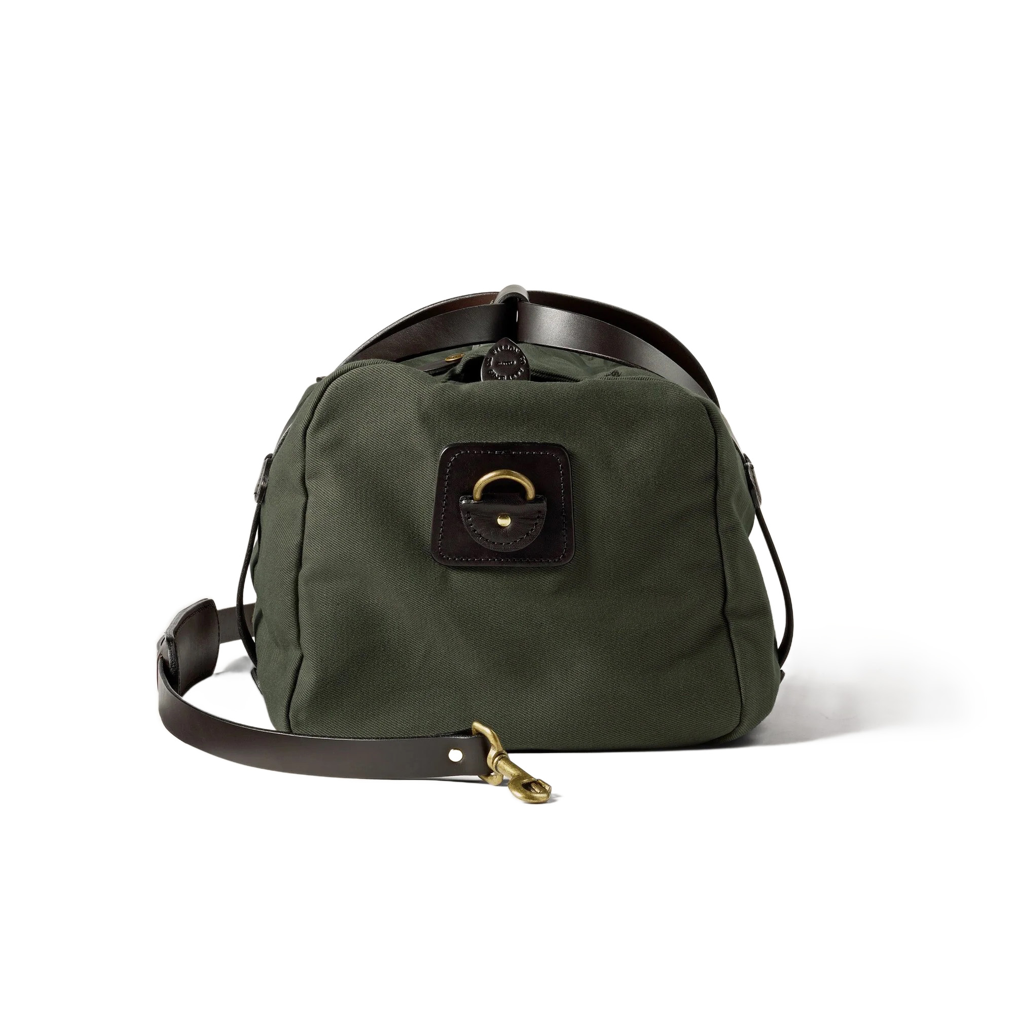 Reisegepäck aus dem Hause Filson in Seattle hält den härtesten Anforderungen stand. Bereits im letzten großen Goldrausch am Klondike zum Ende des 19. Jahrhunderts gehörten die Produkte von Filson aufgrund ihrer außergewöhnlichen Robustheit zu den Favoriten der damaligen Goldsucher. Das Gepäck besteht aus einem besonders schweren, dicht gewebten Baumwolltwill (746 g/m²), der durch Behandlung mit einem speziellen Paraffinwachs wasserbeständig gemacht wurde. Reißverschlüsse und sonstige Metallteile bestehen aus korrosionsbeständigem Messing, alle Lederapplikationen werden aus besonders starkem vegetabil gegerbtem Rindsleder gefertigt. Hergestellt werden die Taschen bis heute in Filsons Fabrik in Seattle. Zur Reinigung mit einem feuchten Schwamm abwischen oder abbürsten. Nicht waschen, nicht chemisch reinigen. Die Reißverschlüsse lassen sich anfangs möglicherweise noch ein wenig schwer bewegen, was sich jedoch mit der Zeit legt; ebenso wird das Sattelleder mit Gebrauch weicher.