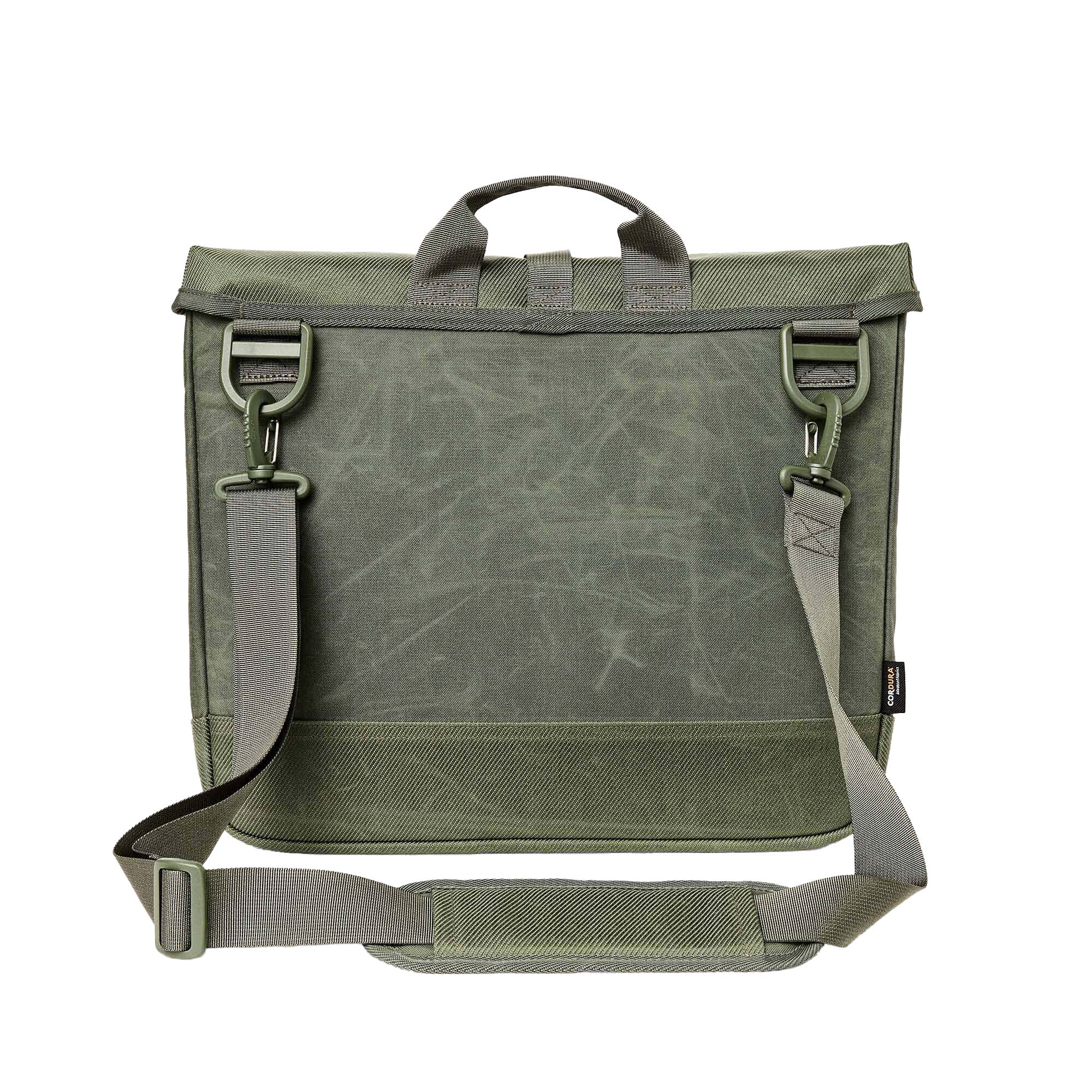 Leichte und strapazierfähige Umhängetasche aus gewachstem Cordura-Nylon mit 14 Litern Fassungsvermögen. Sie verfügt über ein gepolstertes Laptop-Fach, eine elastische Schlaufe für Flaschen, zahlreiche Reißverschlusstaschen außen und einen abnehmbaren Schultergurt. Materialmix aus recyceltem Schaumstoff und langlebigem Cordura-Nylon. Maße: 40,6 x 7,9 x 33 cm.