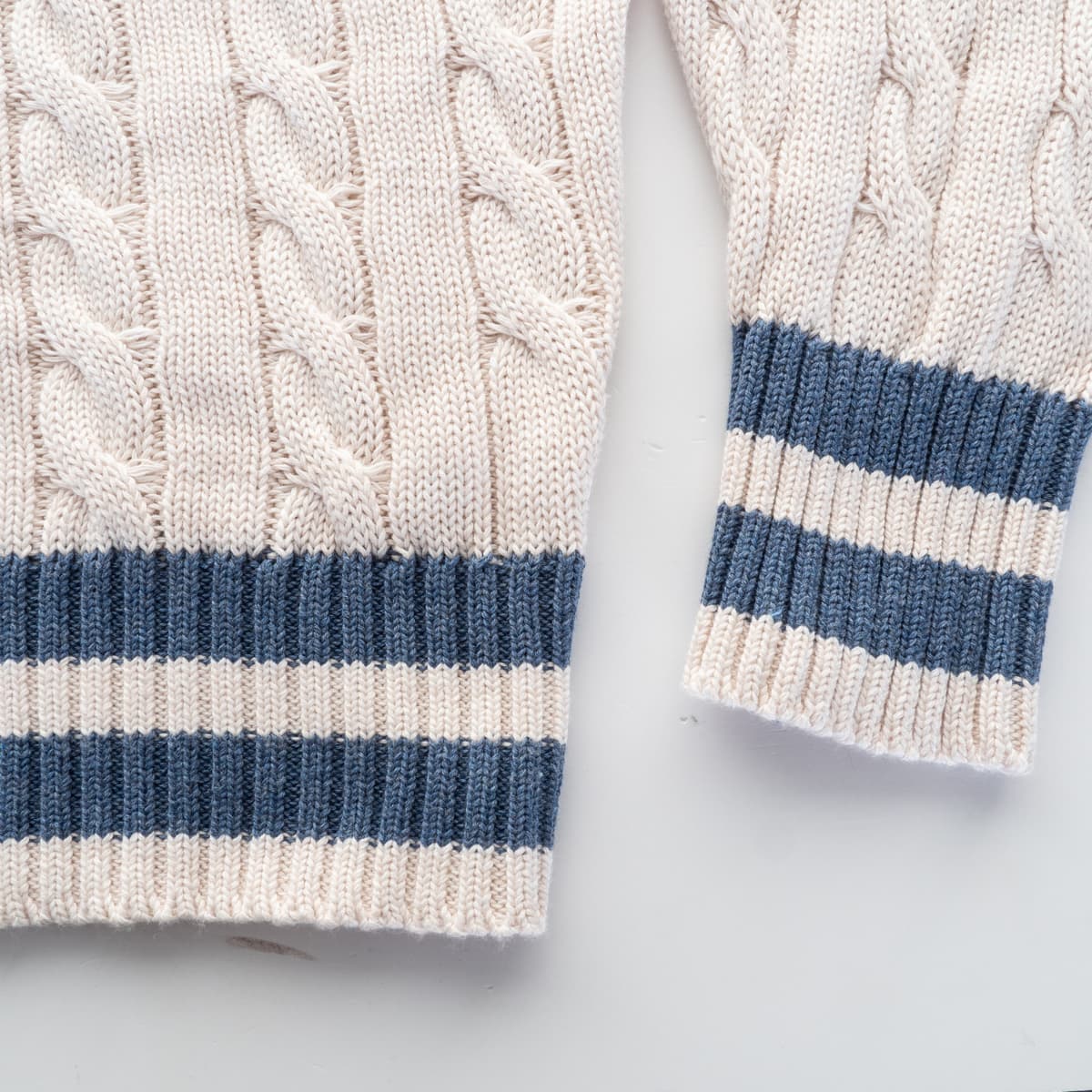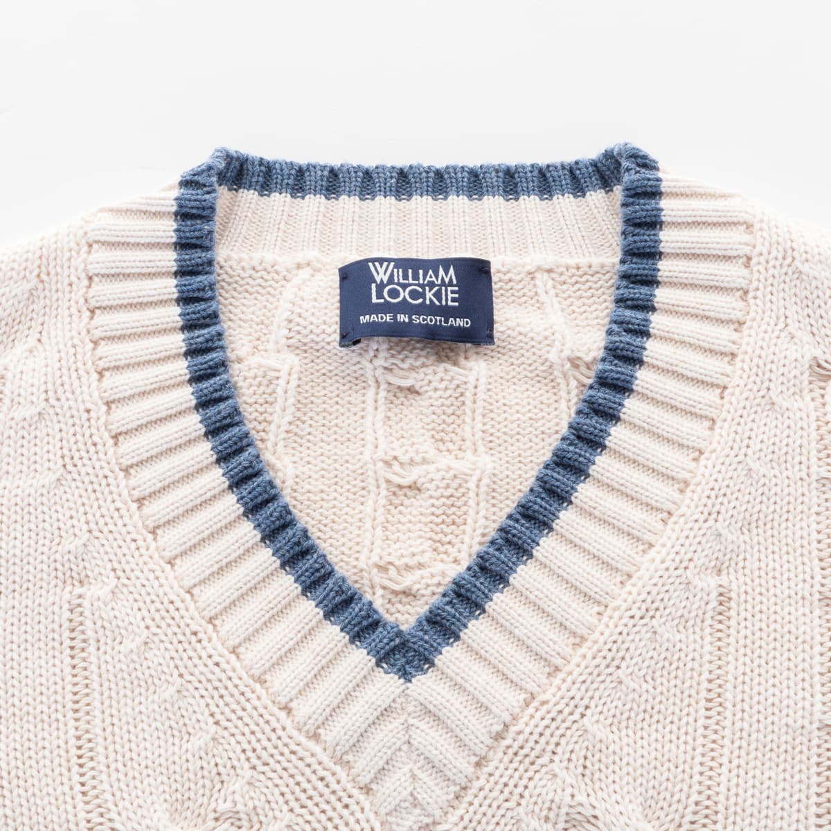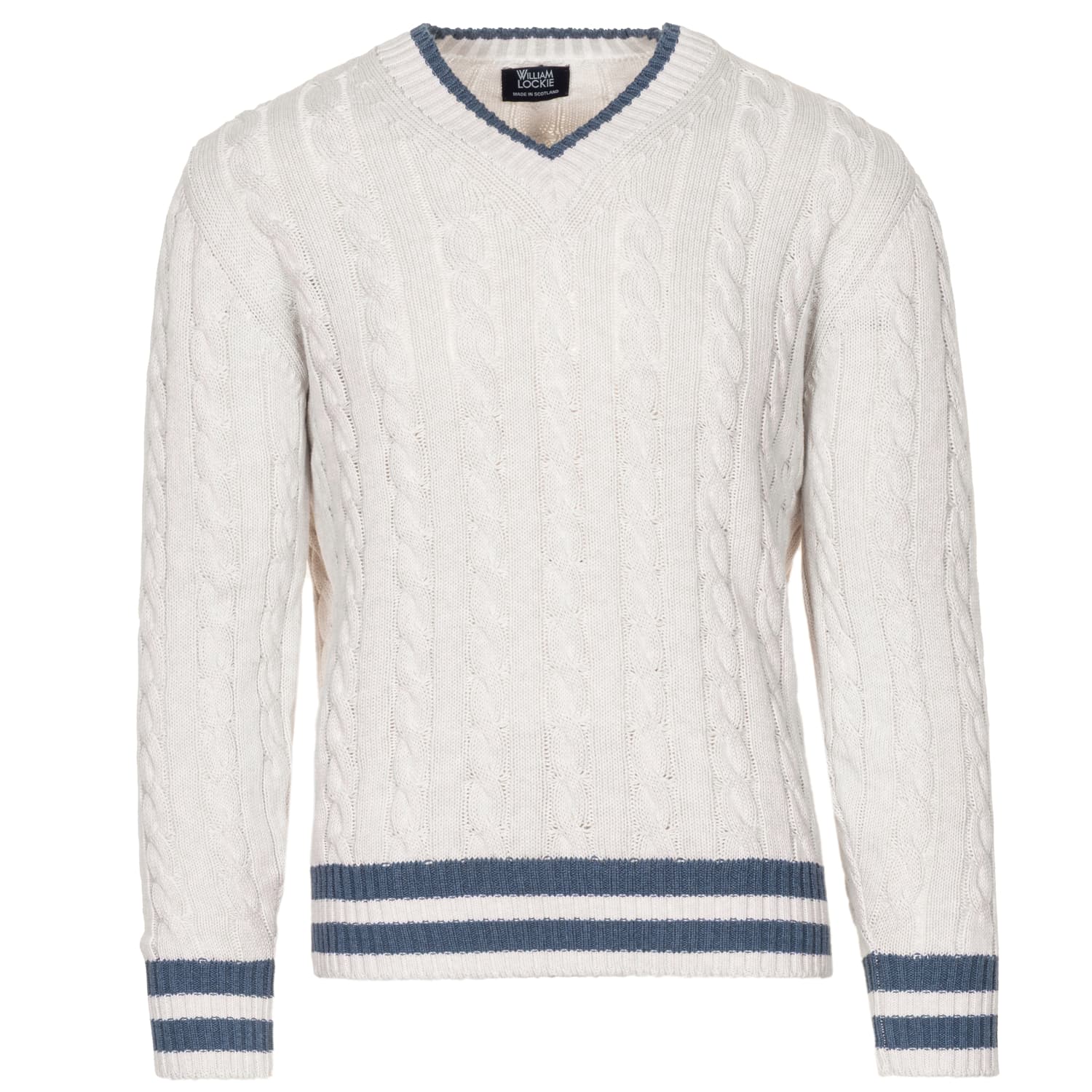 Hochwertiger Cricket-Pullover von William Lockie aus reiner Baumwolle. Der klassische V-Ausschnitt in Kontrastfarbe sowie das traditionelle Zopfmuster verleihen dem Modell seinen zeitlosen, sportlich-eleganten Charakter. Die weiche aber robuste Strickqualität sorgt für ein komfortables Tragegefühl – ideal für den täglichen Einsatz.