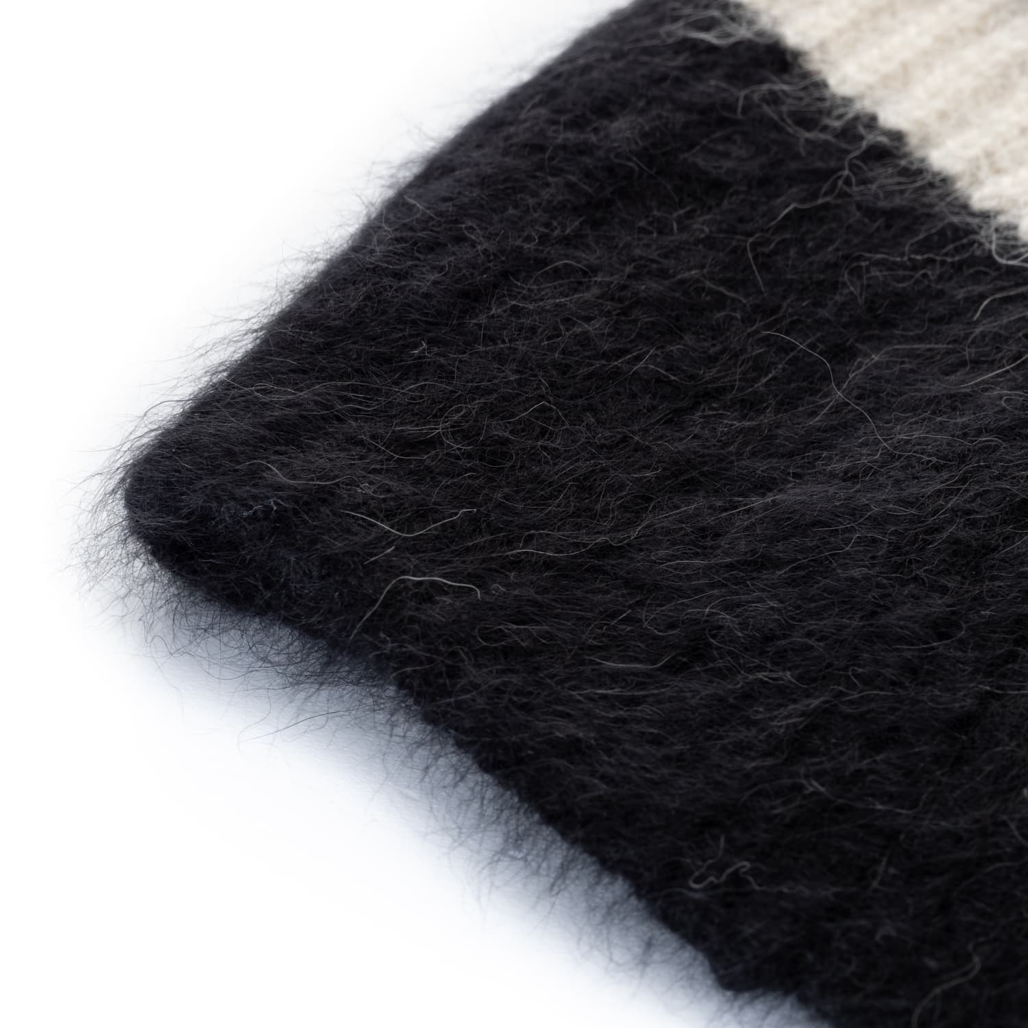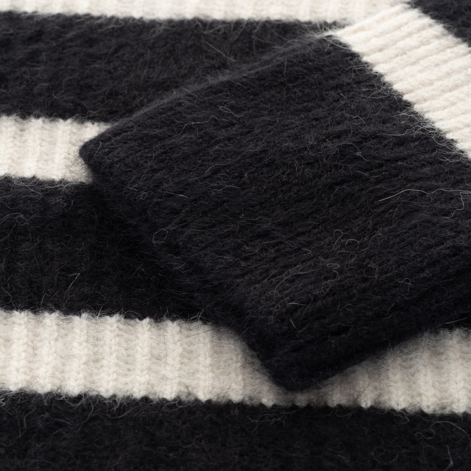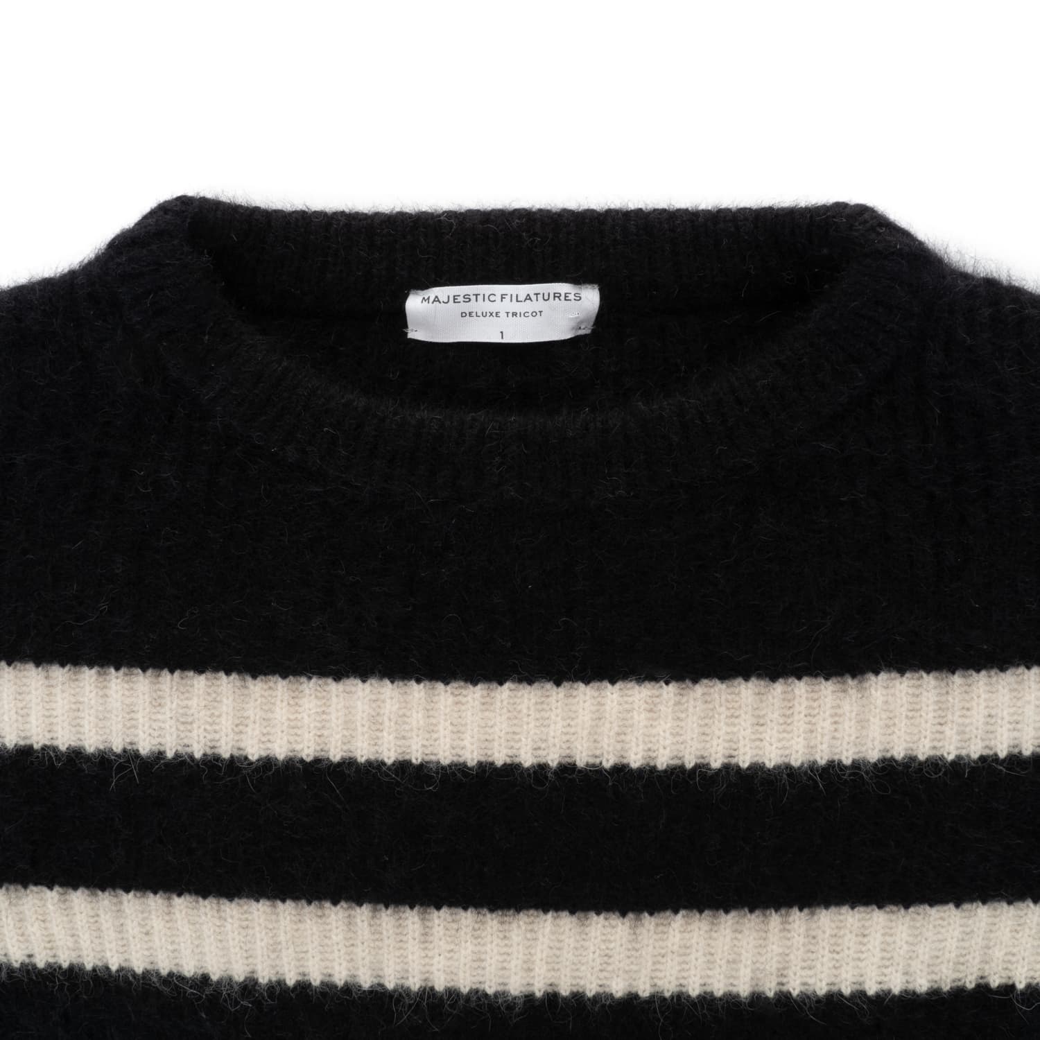 Dieser luxuriöse Strickpullover von Majestic Filatures besticht durch seine außergewöhnlich flauschige Haptik und den modischen Streifen-Look. Gefertigt aus einem edlen Materialmix mit hohem Wollanteil und 40 % Fuchshaar, bietet der Pullover ein besonders weiches, warmes Tragegefühl. Der moderne Streifenverlauf in Schwarz und Natur sowie das farblich abgesetzte Rückenteil machen ihn zum stilvollen Blickfang. Hergestellt in Portugal, steht dieses Modell für zeitloses Design und handwerkliche Qualität.