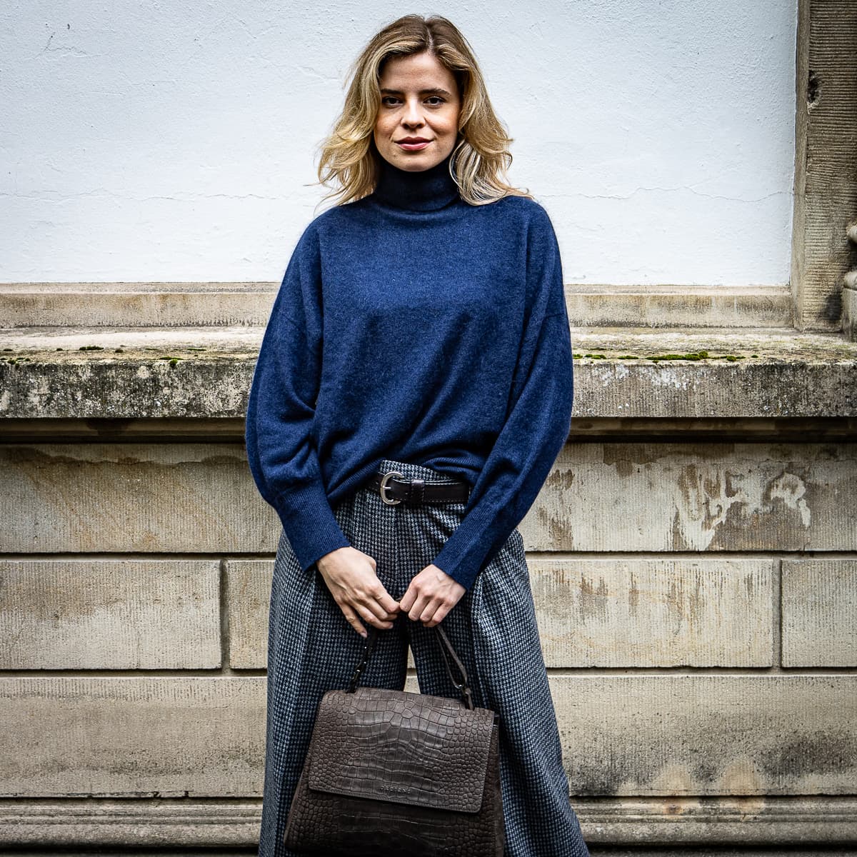Hochwertiger Rollkragenpullover „Mareine“ von Les Tricots de Léa mit flauschiger Haptik und klassischem Design. Dank des edlen Garnmixes aus 70 % Wolle und 30 % Kaschmir trägt sich der Pullover besonders weich und wärmend. Der hohe Rollkragen sorgt für wohlige Wärme an kühlen Tagen, während breite Rippbündchen an Saum und Ärmeln für eine schöne Silhouette sorgen. Ein feminines Basic mit luxuriösem Touch – erhältlich in den Farben Marine und Taupe.
