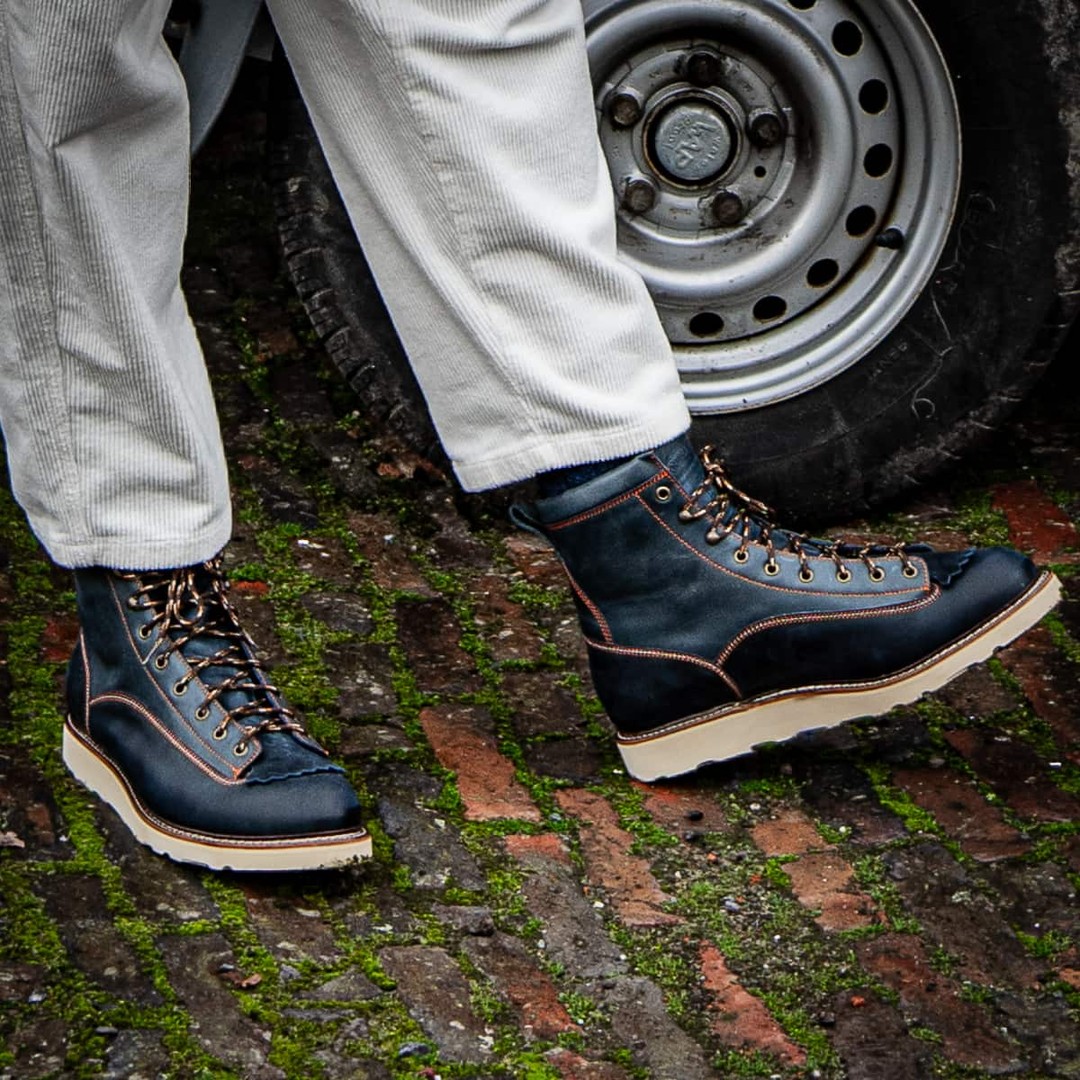 Kräftiges, tief indigogefärbtes Rindleder, präzise Nähte und eine klassisch, rahmengenähte Konstruktion stehen hier für echtes Schuhmacherhandwerk. Stabil, langlebig und dennoch angenehm leicht getragen ein Schuh, der durch Materialwahl, Aufbau und Verarbeitung überzeugt und mit der Zeit seinen ganz eigenen Charakter entwickelt.