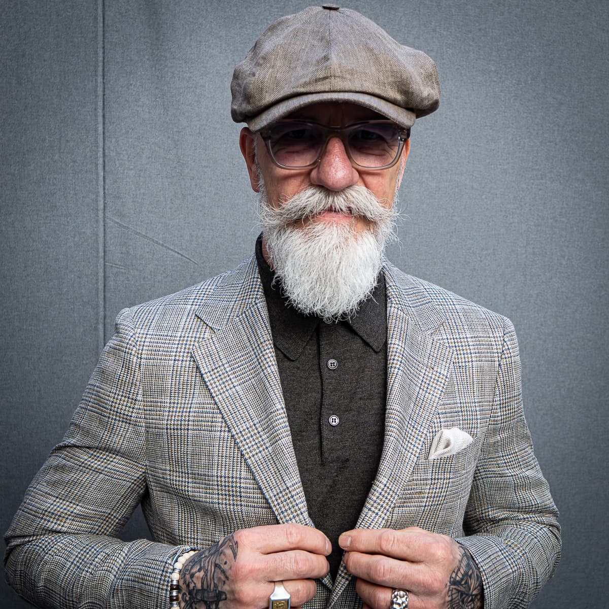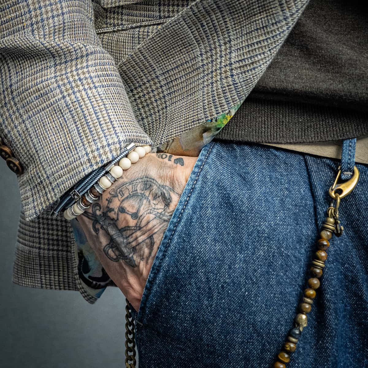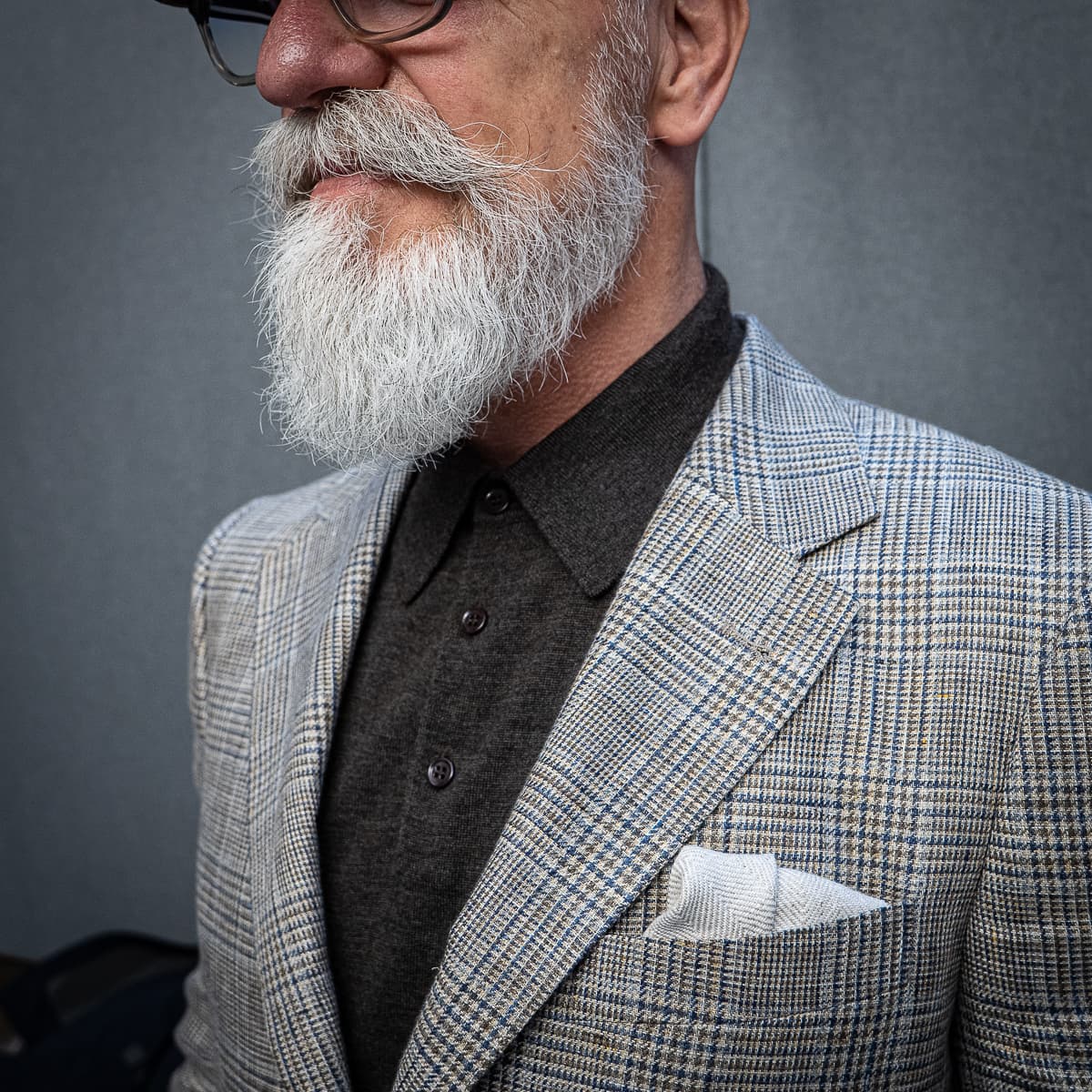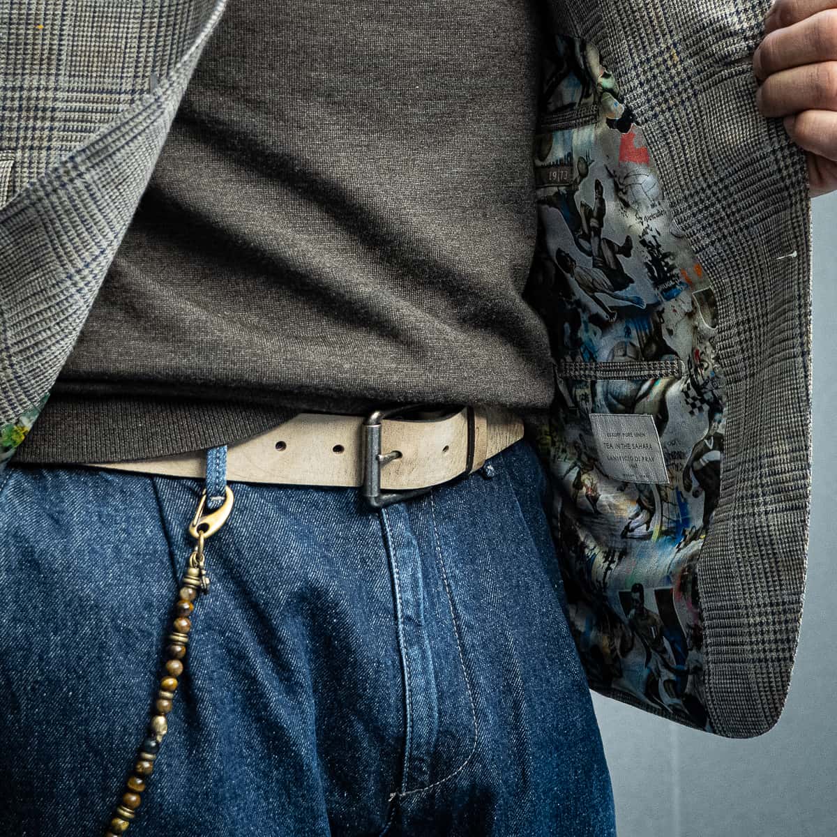 Die Struktur des Sakkos, das Einstecktuch, das Innenfutter, Gürtel und Accessoires – jedes Element trägt seinen Teil dazu bei und verleiht dem Look Tiefe und Persönlichkeit.