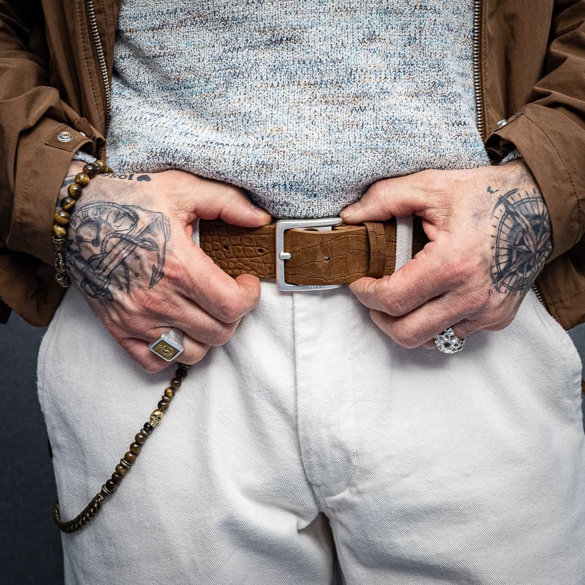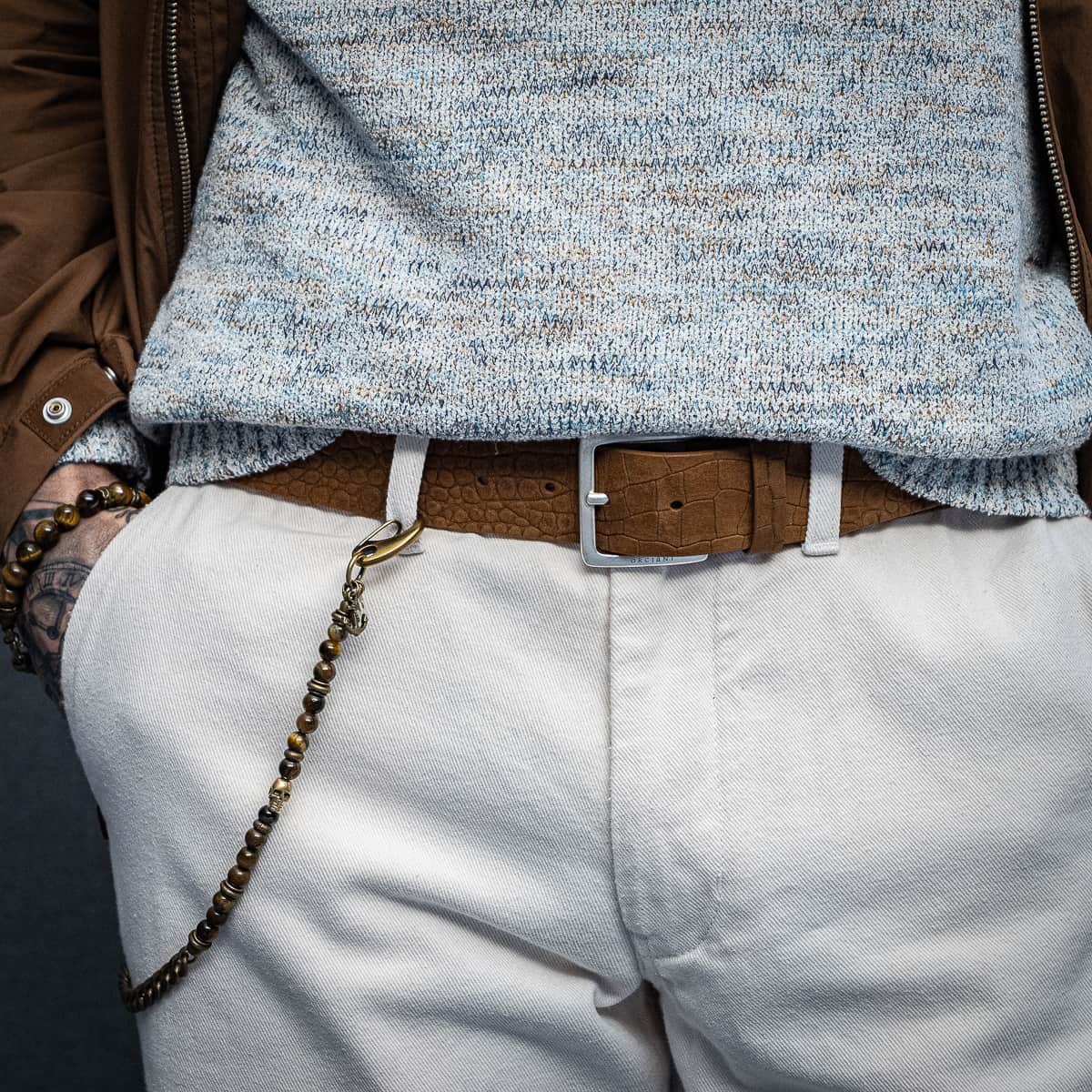 Dazu ein Ledergürtel in warmem Braun, der sich ruhig einfügt und die Farben aufnimmt.