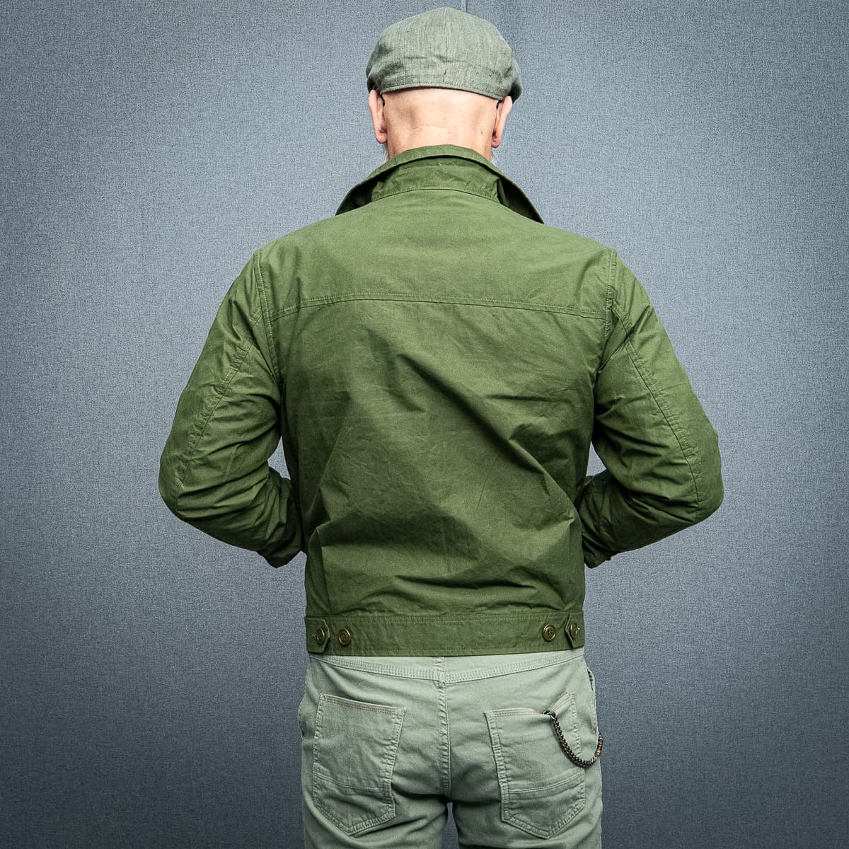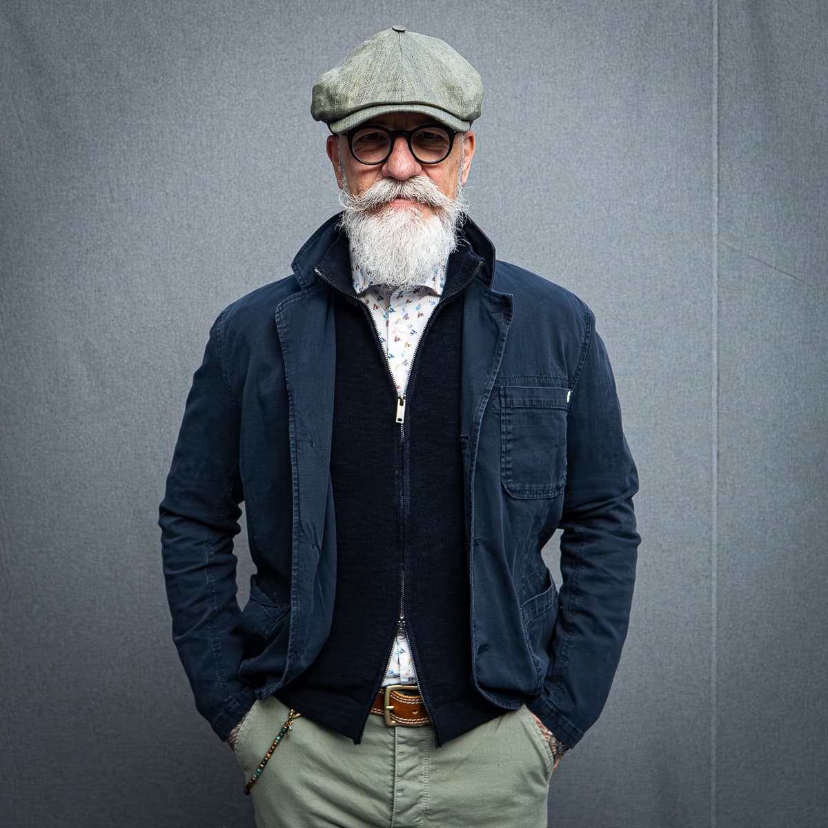 Die Basis des Looks: Leinen-Cap, ein gemustertes Baumwollhemd, darüber ein Zipper aus Baumwollstrick. Dazu eine helle Chino mit Military-Details und robuste Lederschuhe.
