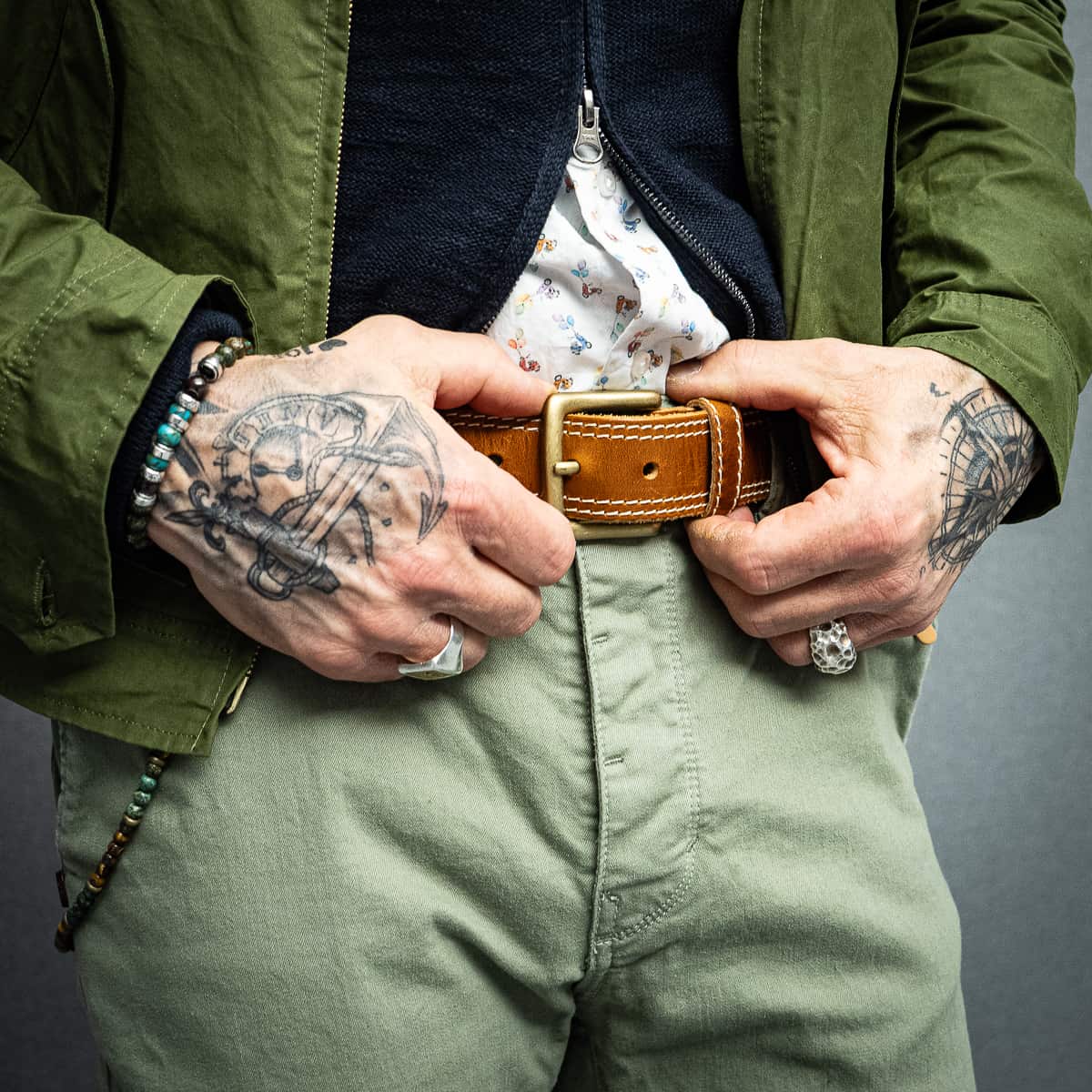 Abgerundet wird das Outfit durch gestreifte Socken, eine markante Wallet Chain, einen Ledergürtel mit Messingschließe und ein Armband aus Natursteinen und Silber.