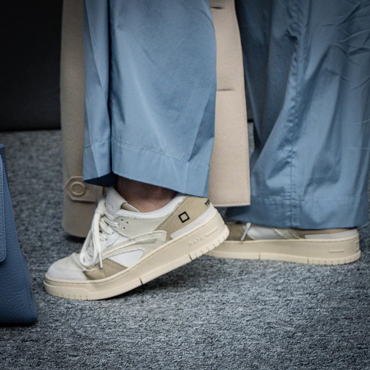 Die Accessoires geben dem Look seine eigentliche Richtung: der Gürtel in weichem, genarbtem Leder greift die Farbe der Tasche auf und verbindet beides zu einer ruhigen, stimmigen Linie. Die Tasche selbst wirkt klar und präsent, ohne laut zu sein – strukturiert, hochwertig und genau richtig dimensioniert für den Alltag. Dazu setzt das Seidentuch einen leichten Kontrast, bringt Bewegung ins Outfit und nimmt die Blautöne subtil wieder auf. Es sind genau diese Details, die den Unterschied machen – nicht als Einzelstücke gedacht, sondern als Zusammenspiel, das den Look trägt.