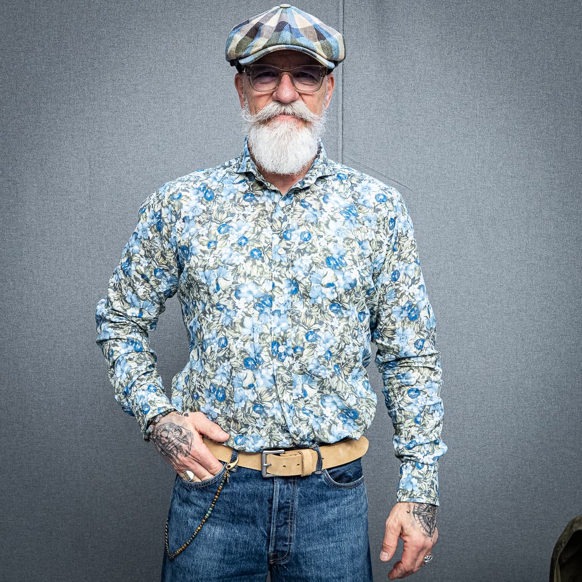 Die Accessoires verleihen dem Look seine besondere Tiefe: Ein naturbelassener Ledergürtel mit schlichter Metallschließe bildet die ruhige Basis, während eine seitlich befestigte Perlenkette mit kleinem Anhänger für einen individuellen, bewegten Akzent sorgt. Markante Silberringe und ein Armband aus Steinperlen greifen das Spiel aus kühlen und warmen Tönen auf und unterstreichen die handwerkliche Anmutung. Ein floral gemustertes Einstecktuch setzt einen dezenten Farbakzent, während die karierte Schiebermütze und die zurückhaltende Brille dem Outfit eine zeitlose, charakterstarke Note verleihen.