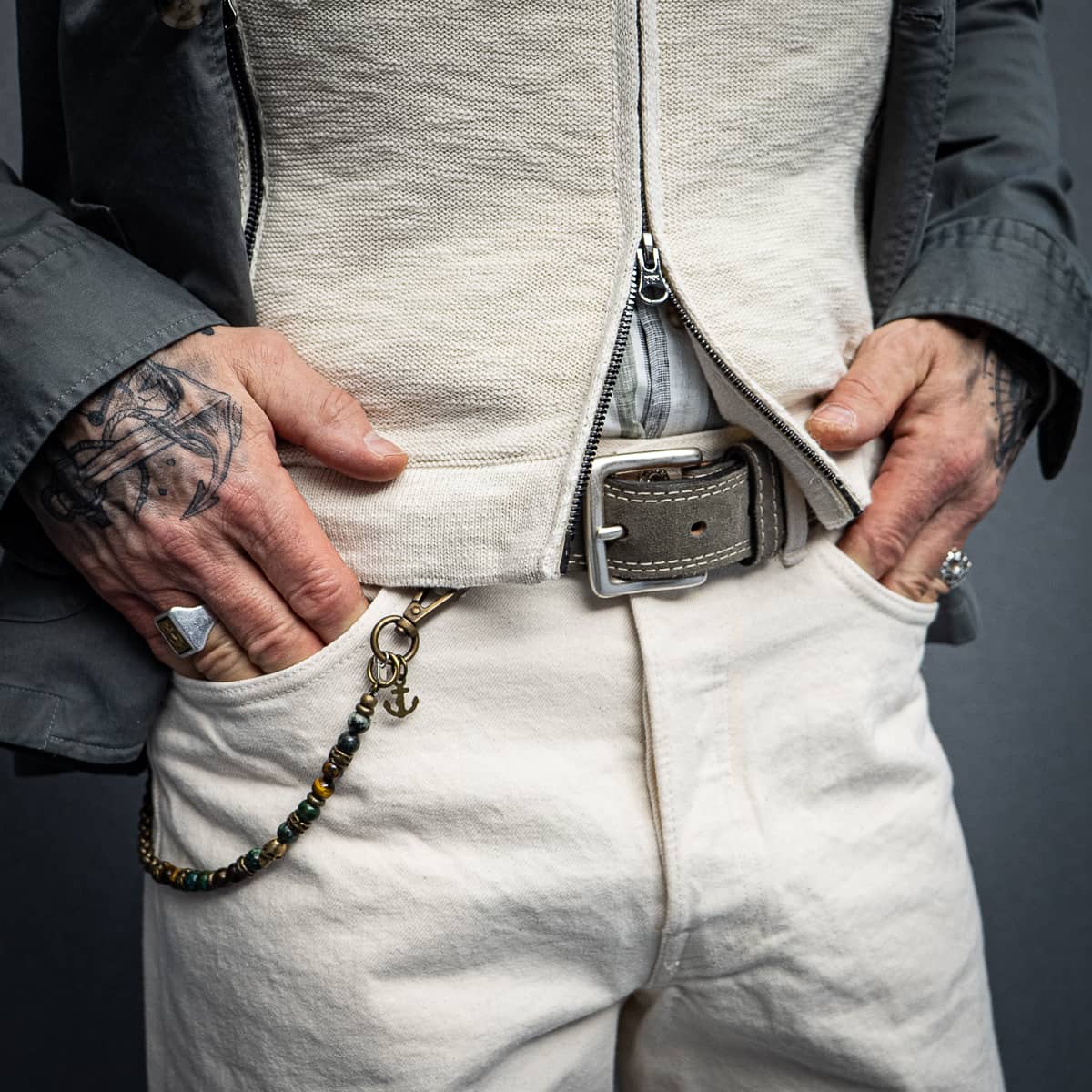 Die Details setzen die Akzente – eine Newsboy-Cap aus Leinen-Wolle-Gemisch, ein Veloursledergürtel mit Kontrastnaht, gestreifte Socken, Armbänder aus Natursteinen und Metall sowie eine prägnante Wallet Chain.