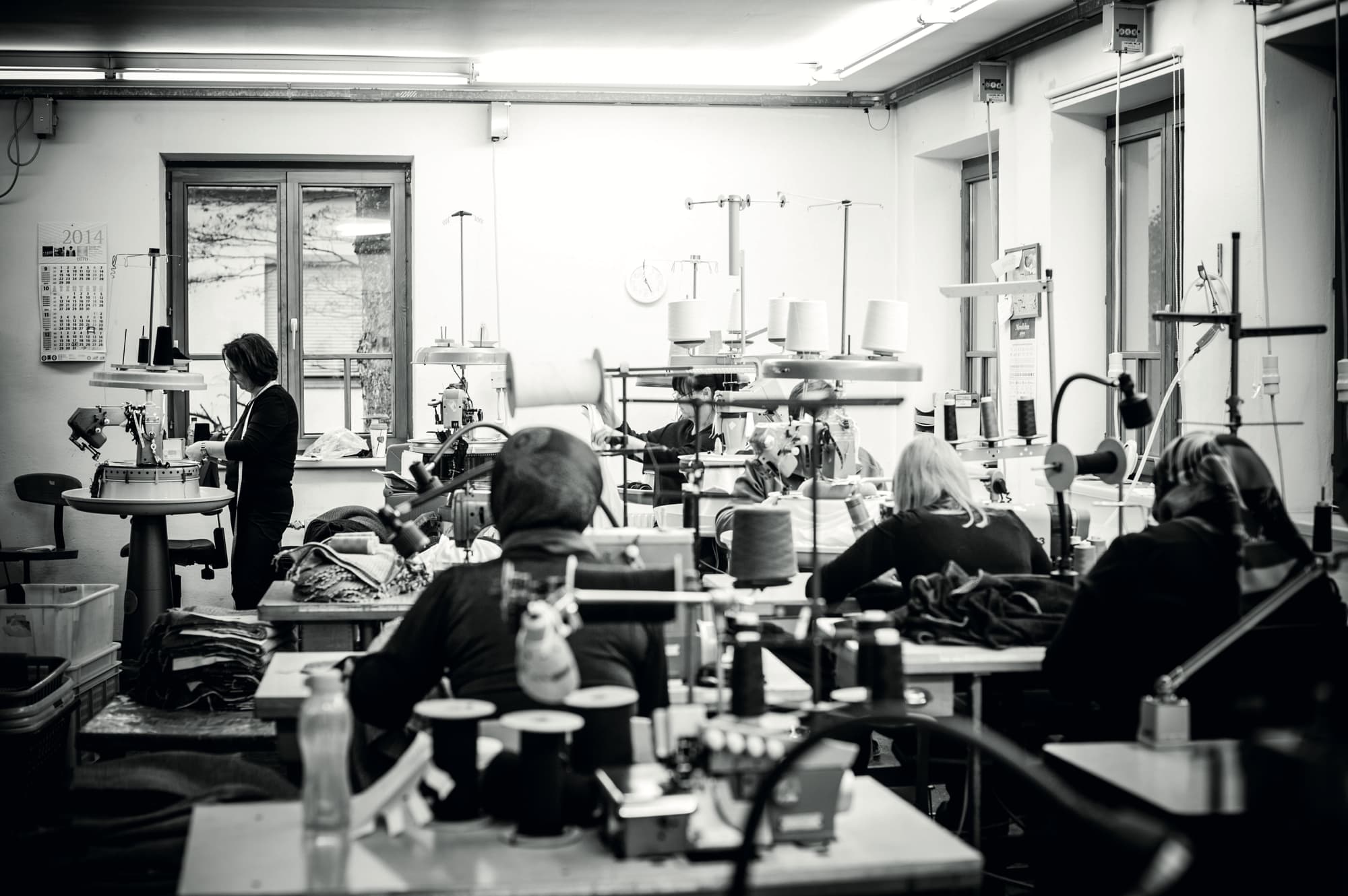 Da wir in den Kollektionen sehr individuell mit Materialen mixen, müssen alle Näherinnen auch das Verarbeiten von Leder, Fell, Nylon, Walk, Stepp oder anderen Materialien beherrschen. Das fertig genähte bzw. gekettelte Teil wird aufwändig handgearbeitet und verlässt dann die Näherei in Richtung Büglerei.